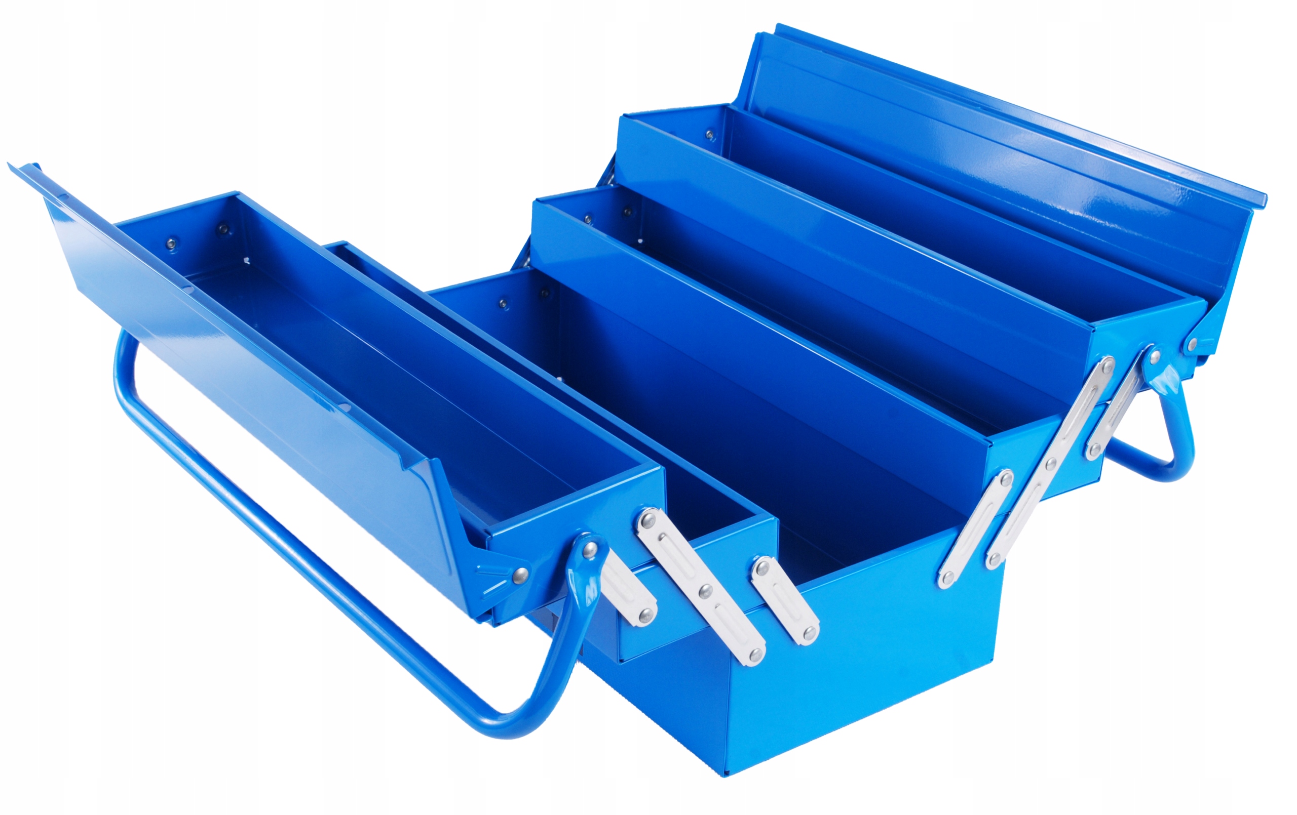 Metalowa skrzynka na narzędzia i drobne elementy. Sztywna konstrukcja gwarantuje trwałość i niezawodność produktu