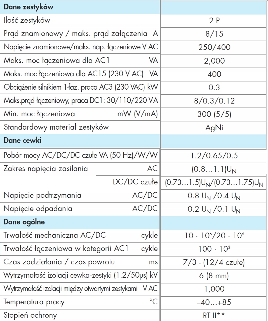 Obciążalność styków AC @R (przy obciążeniu rezystancyjnym): 8A / 250V AC