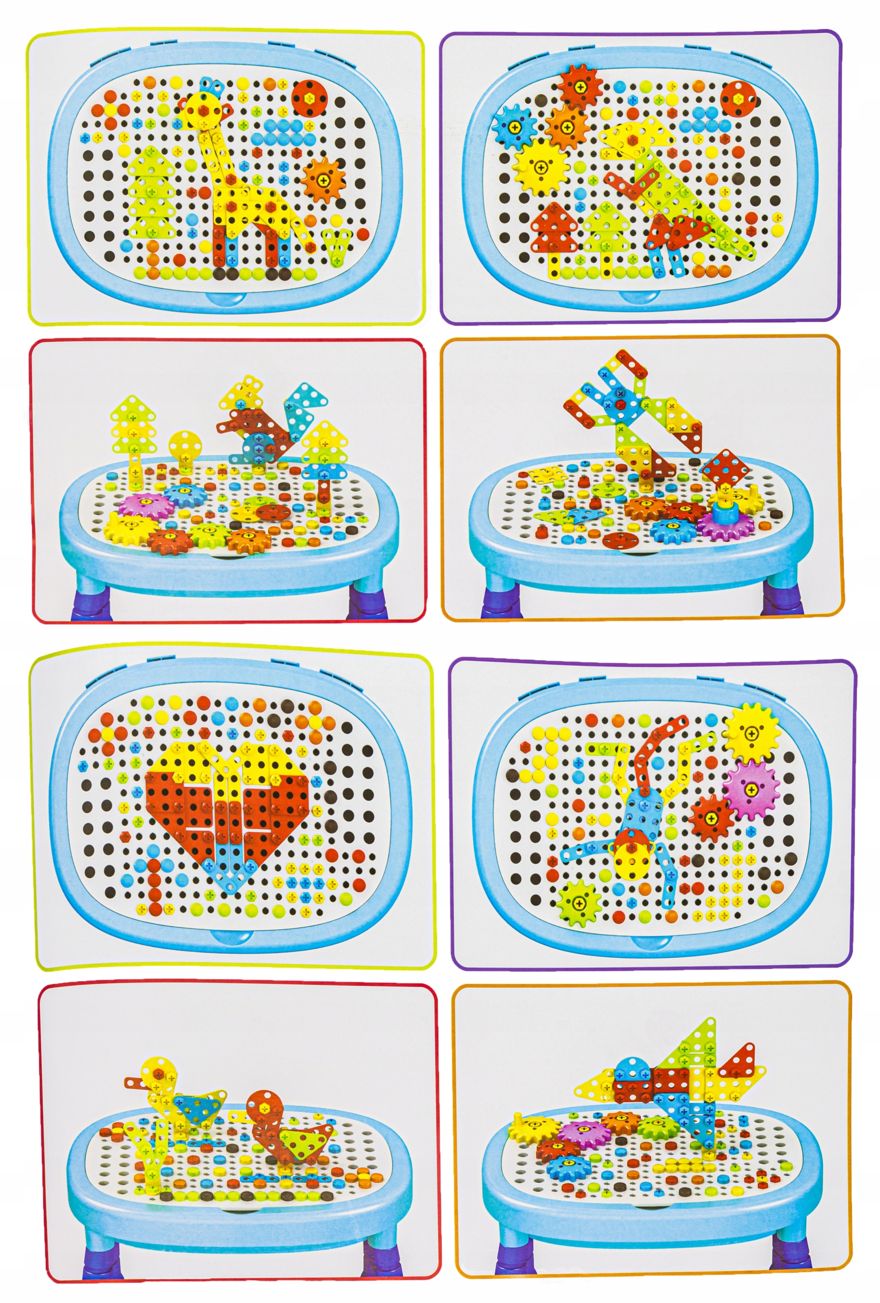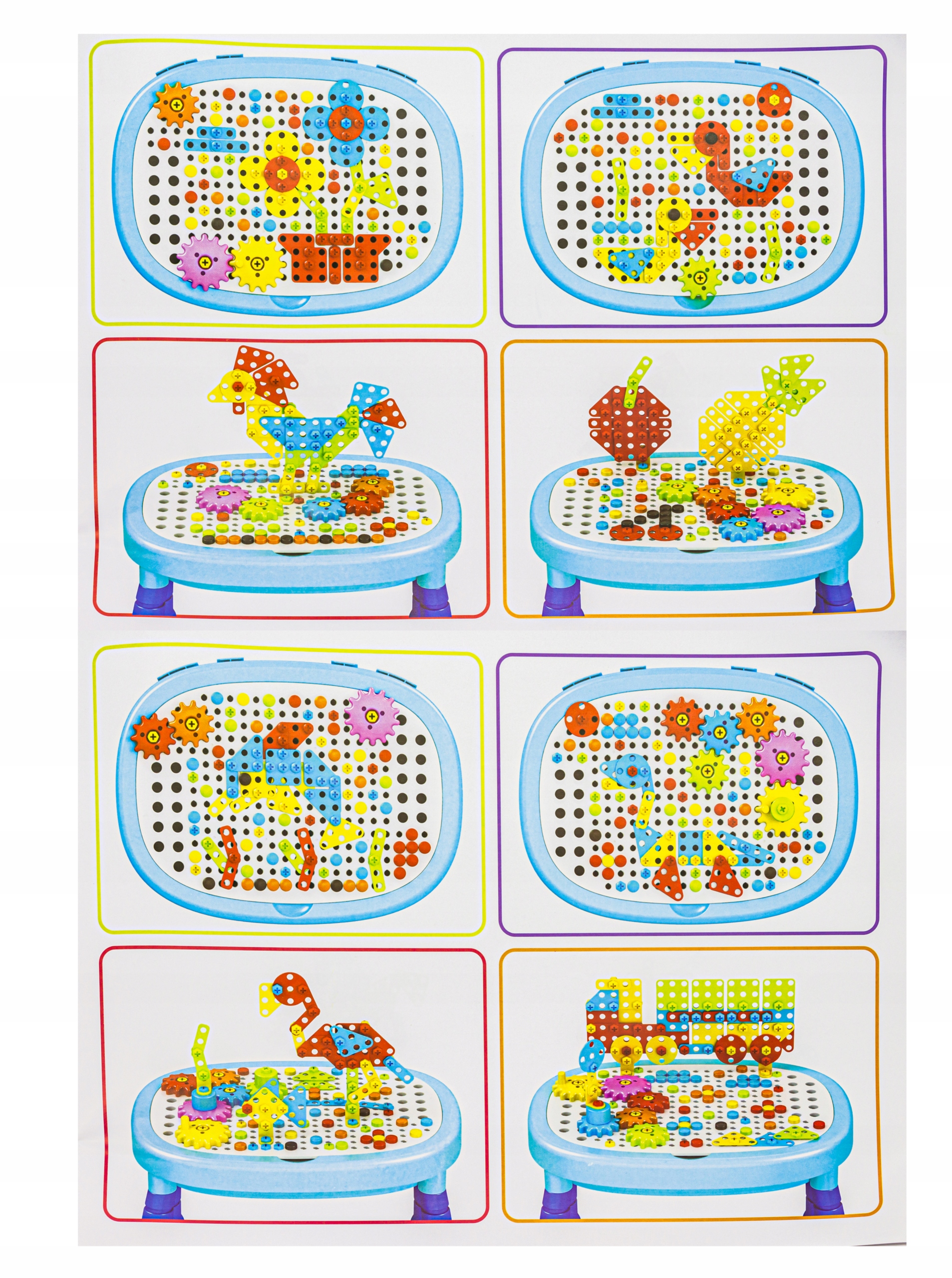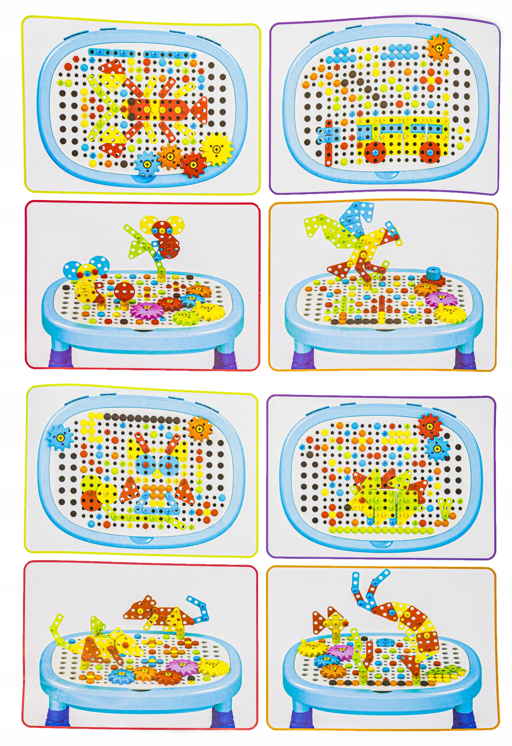 Ułożenie konkretnego wzoru mozaiki wymaga wkręcania sporej liczby śrubek. Aby umilić i uatrakcyjnić zabawę - zestaw wyposażony został w obrotową wkrętarkę. Posiada ona lewe i prawe obroty, dzięki czemu możemy nią zarówno wkręcać śrubki jak i rozkręcać - do modyfikacji lub po skończonej zabawie. Wkrętarka zasilana jest dwoma bateriami 1,5V AA (brak w zestawie).