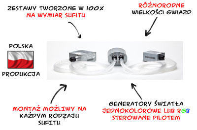 Gwiezdne niebo to zestaw składający się z wiązek światłowodów oraz generatora światła LED RGBW. Stanowi imitację nieba pełnego gwiazd na suficie w Twojej sypialni, salonie, pokoju dziecka czy nawet w łazience nad wanną.