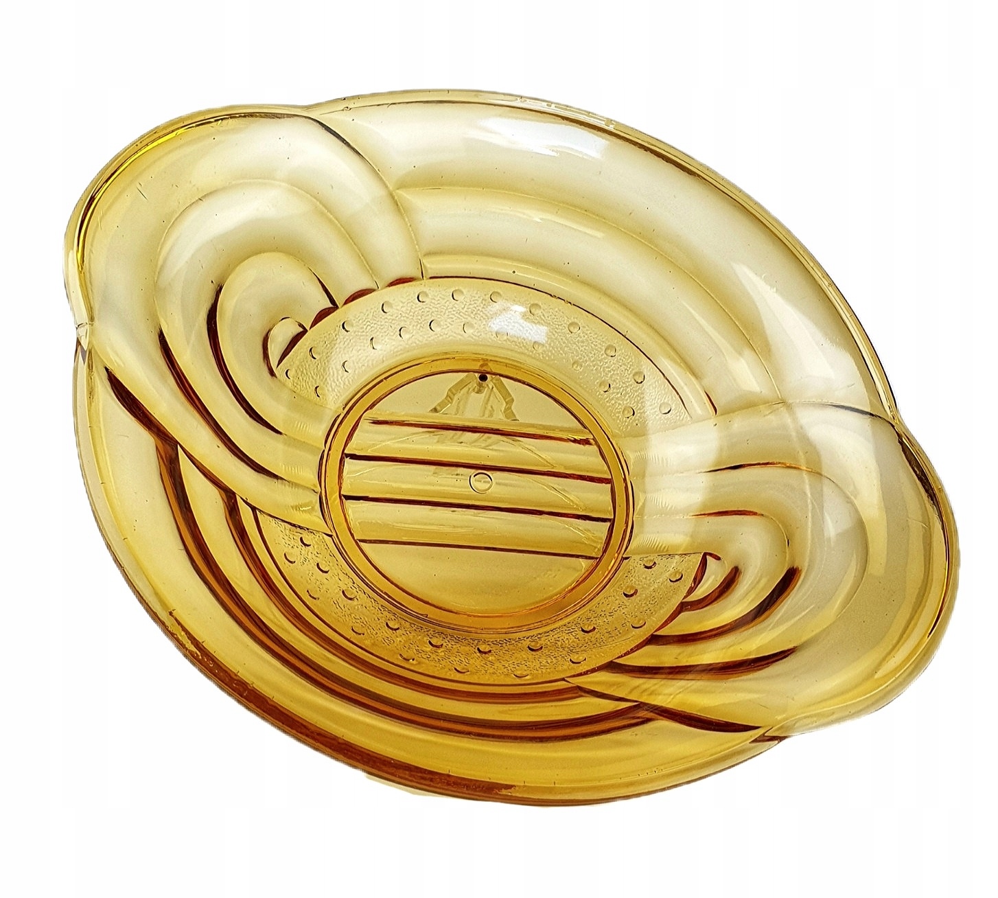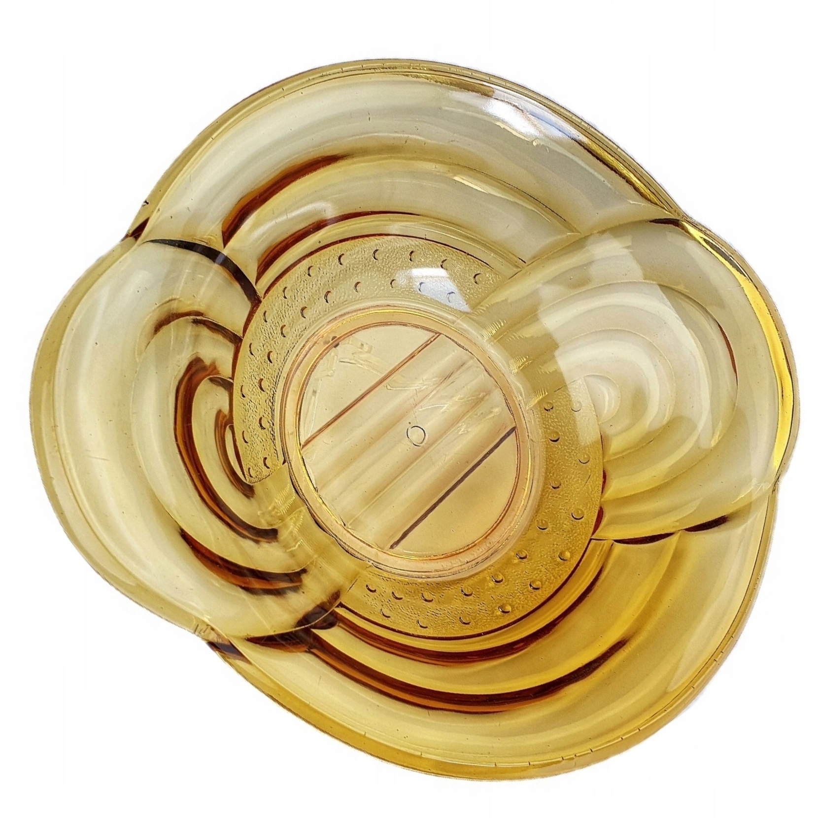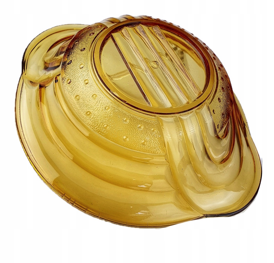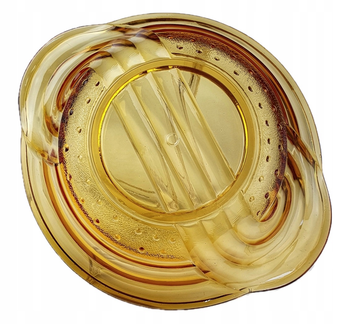 PIĘKNA BURSZTYNOWA MISA ZE SZKŁA PRASOWANEGO.