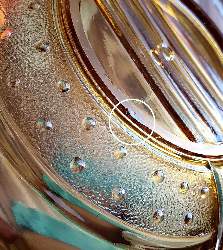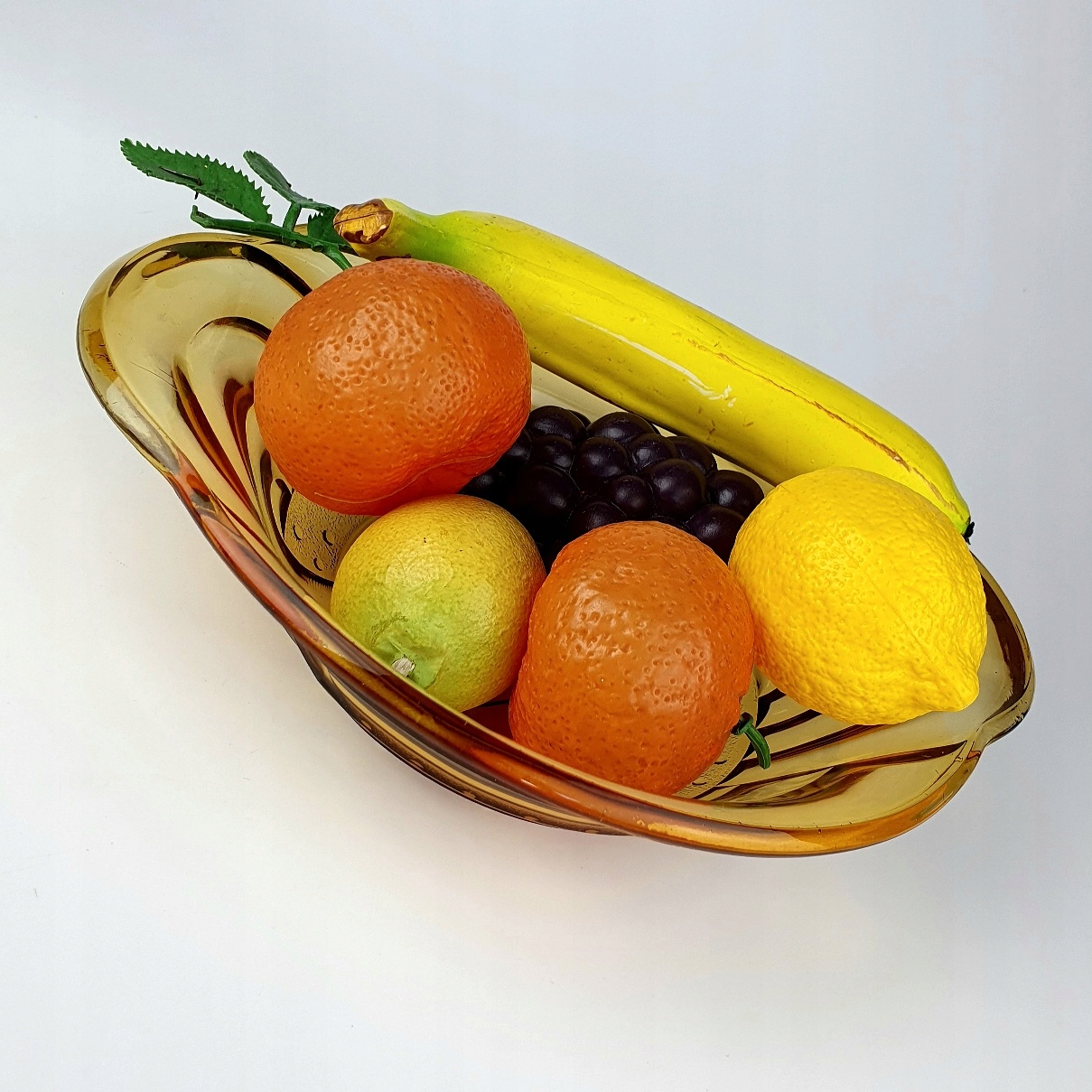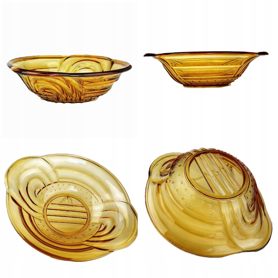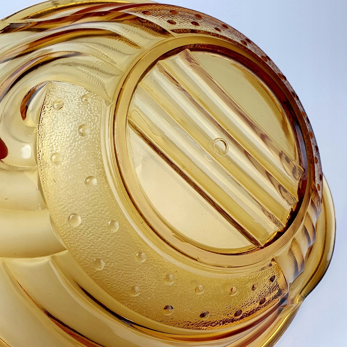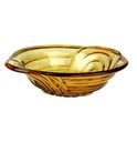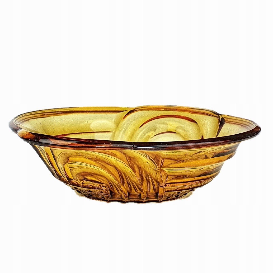 PIĘKNA BURSZTYNOWA MISA ZE SZKŁA PRASOWANEGO.