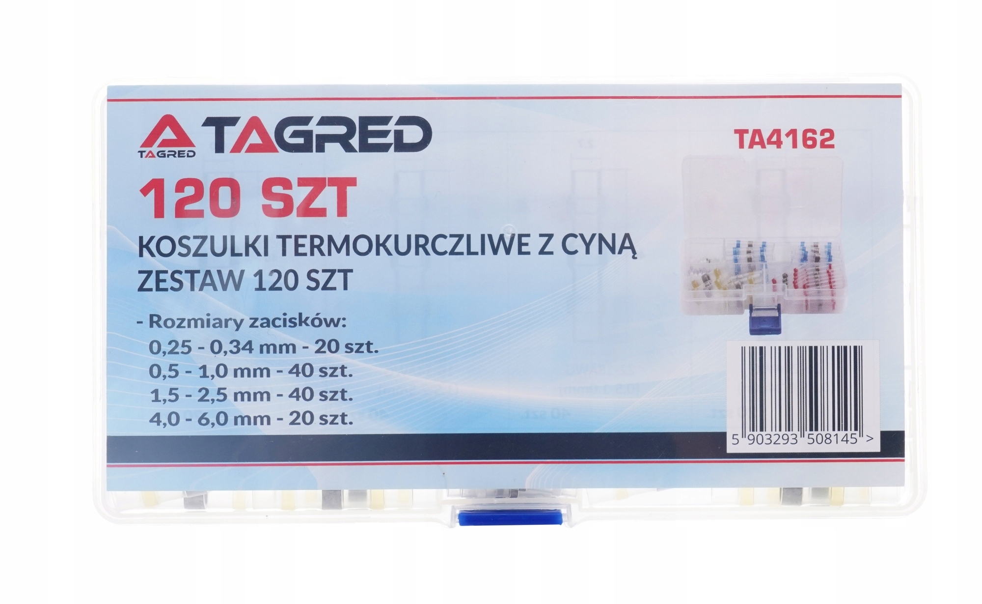 Hermetyczne termokurczliwe złącza lutownicze TAGRED cechuje doskonała odporność na rozciąganie i uszkodzenia mechaniczne, dwuścienne rurki polioetylenowe po zewnętrznej stronie i z cyną w środku który zapewnia doskonałą wodoodporność. Wewnątrz każdej szybkozłączki znajduje się warstwa kleju, która wzmacnia i zabezpiecza połączenie przed wilgocią. Po złączeniu przewodów nie wymagana jest żadna dodatkowa izolacja. Nasze szybkozłączki można stosować w samochodach, łódkach, motocyklach i gospodarstwie domowym,