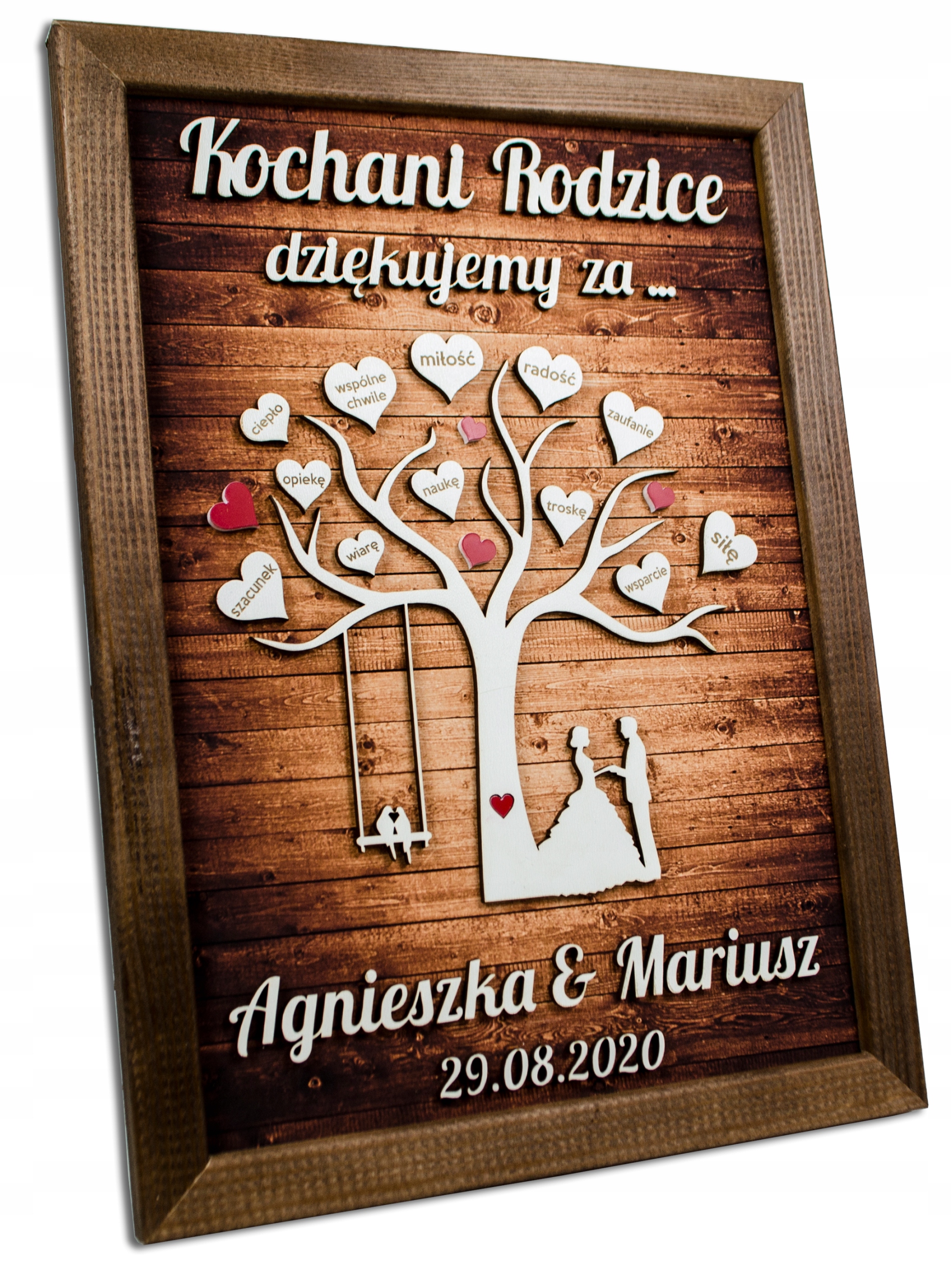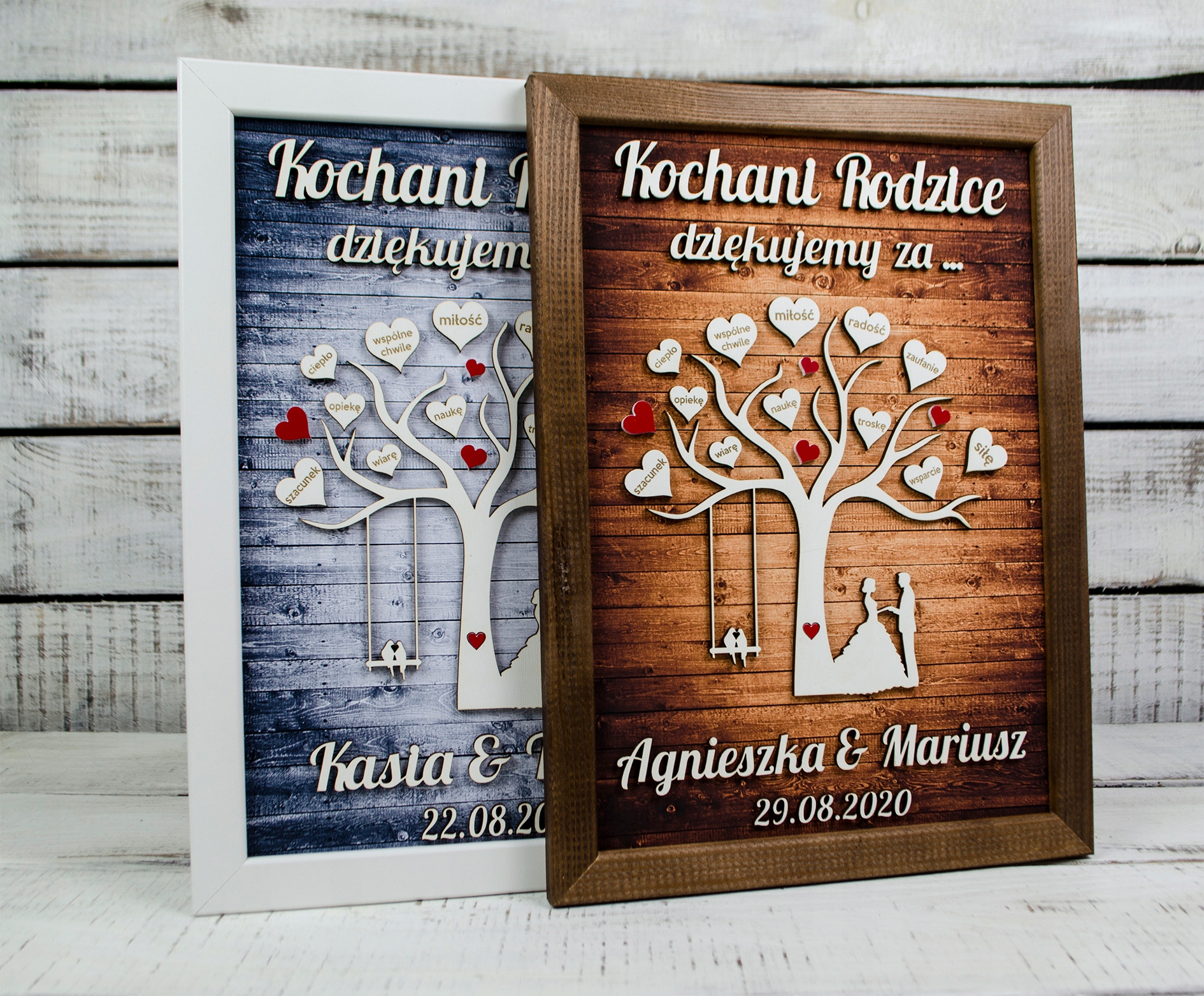 В рамке, в дополнение к дате и именам жениха и невесты, есть печатные тексты с благодарностями. Такие форма подарка будет не только трогательным сувениром, но и найдет применение в качестве эстетическое оформление интерьера.