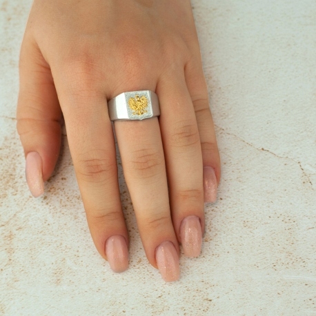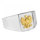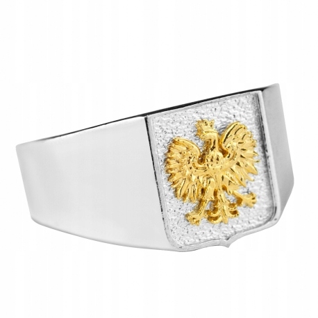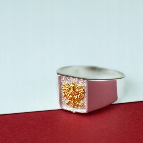 Sygnet z orłem to jedna z propozycji kolekcji patriotycznej. Został stworzony na wzór Godła Polskiego z najwyższą starannością i dbałością o każdy detal. Wykonany jest w całości z polerowanego srebra próby 925. Pokryty oksydą (przyciemniany) aby dodać mu wyrazistości i podkreślić jego wyjątkowy wygląd. Orzeł został dodatkowo pokryty warstwą złota. Idealny na prezent urodzinowy dla patrioty bądź Polaków mieszkających za granicą.