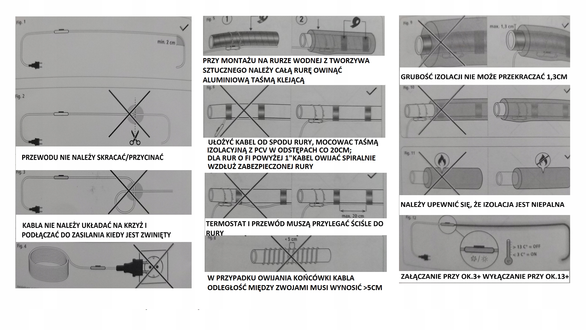 Można stosować do zabezpieczenia przewodów metalowych i z tworzywa sztucznego średnica do 38mm. Dla rur o średnicy do 1" przewód należy mocować wzdłuż rury, w przypadku rur o większej średnicy kabel należy owijać spiralnie wzdłuż zabezpieczanej rury. Kabel należy mocować za pomocą taśmy odpornej na temperaturę bądź spinkami.