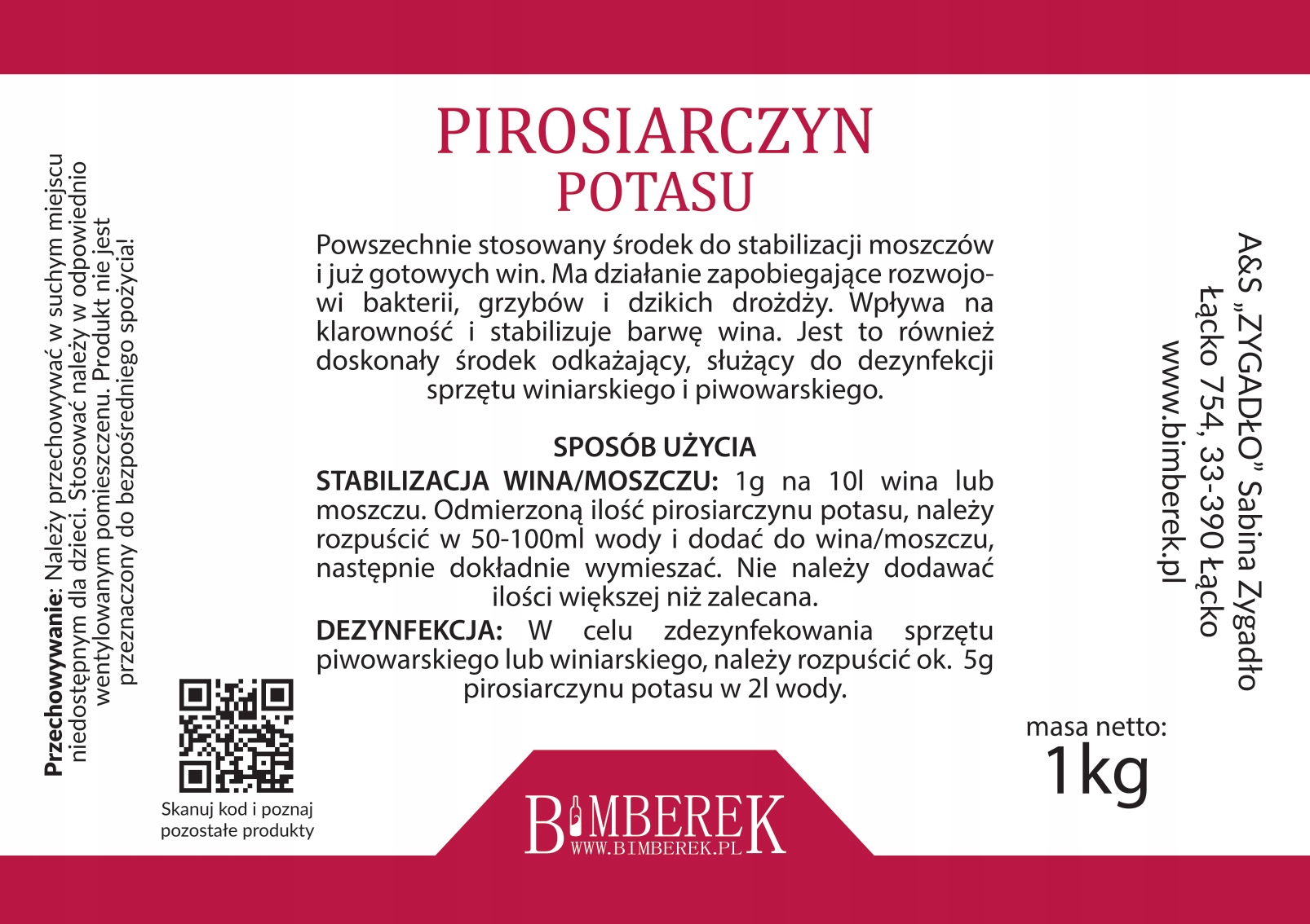 Pirosiarczyn potasu to środek chemiczny powszechnie stosowany do stabilizacji moszczów i win oraz dezynfekcji i płukania sprzętu gorzelniczego, winiarskiego i piwowarskiego.