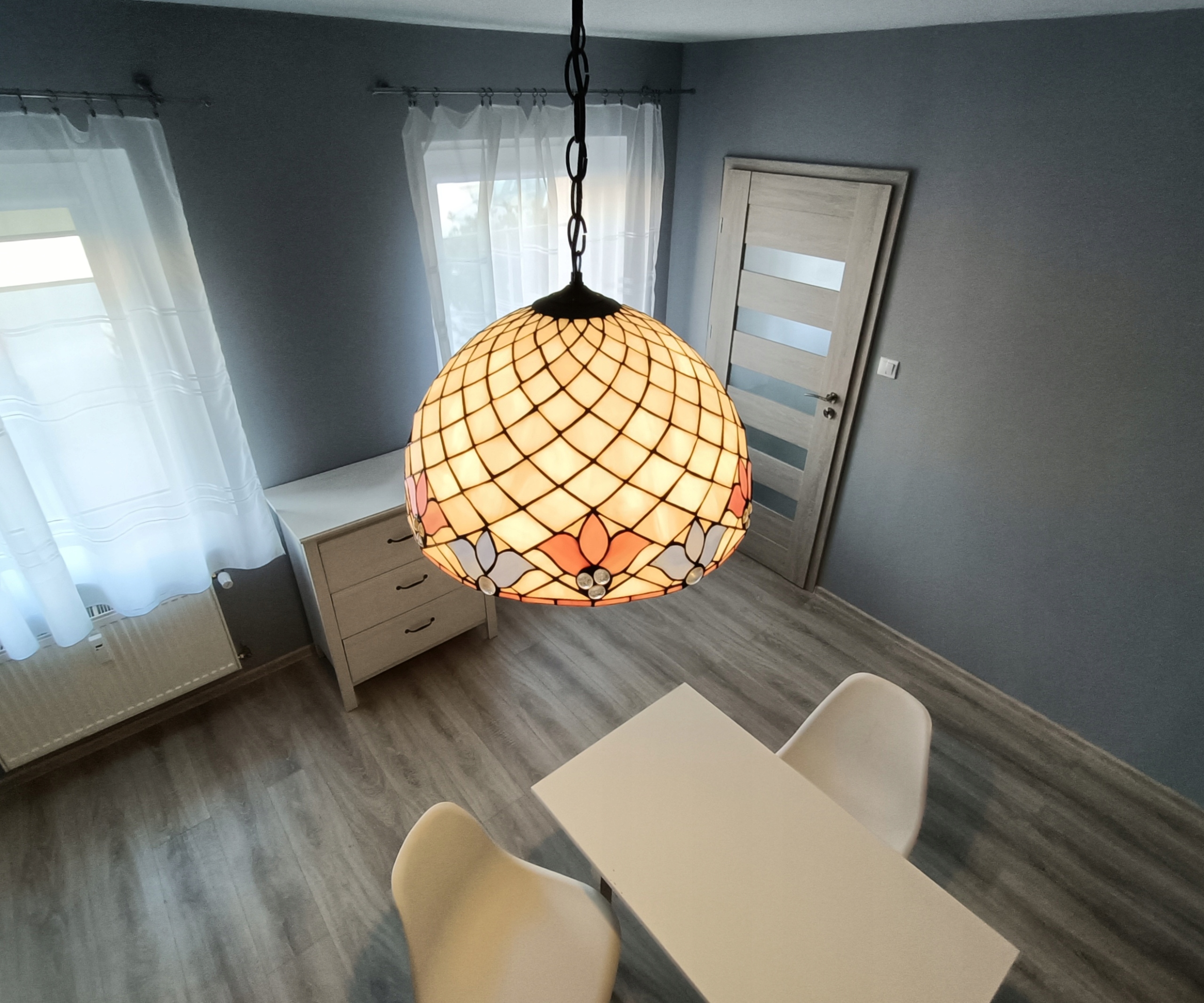 Klosz lampy wykonany przez wprawnych, polskich rzemieślników w 100 % w Polsce. Wykonany jest z ręcznie ciętego szkła. Szkło połączone jest ze sobą miedzią oraz cyną. Cyna zapatynowana jest na czarno by wydobyć głębię kolorów szkła.