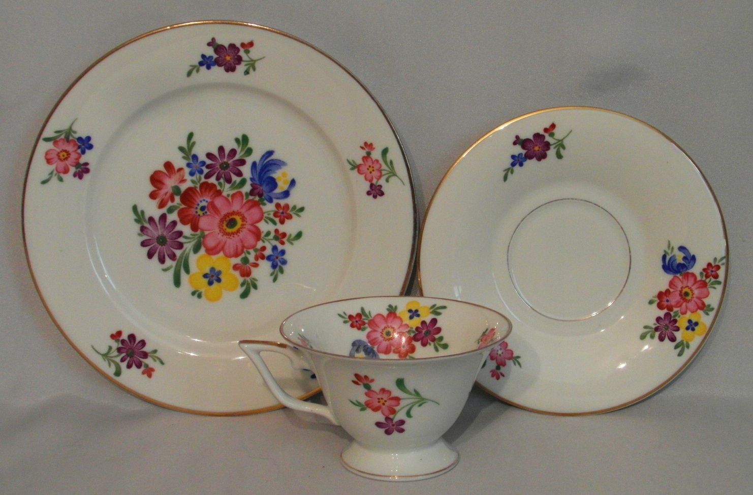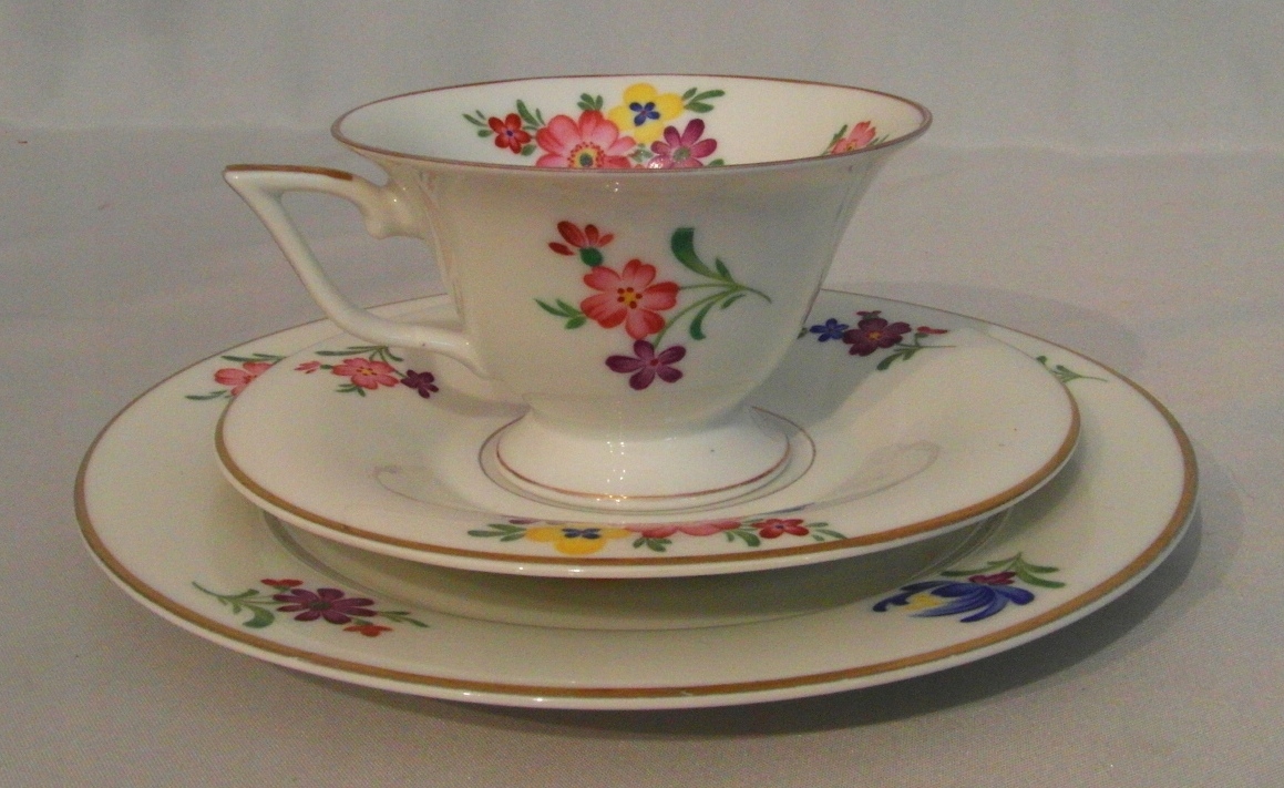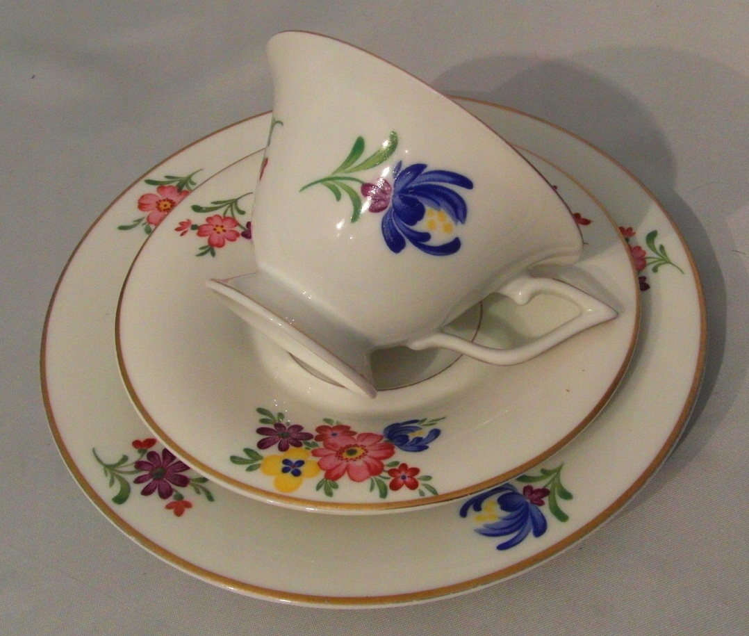 Porcelana biała. Złocenie i ręcznie malowany bukiet kwiatowy.