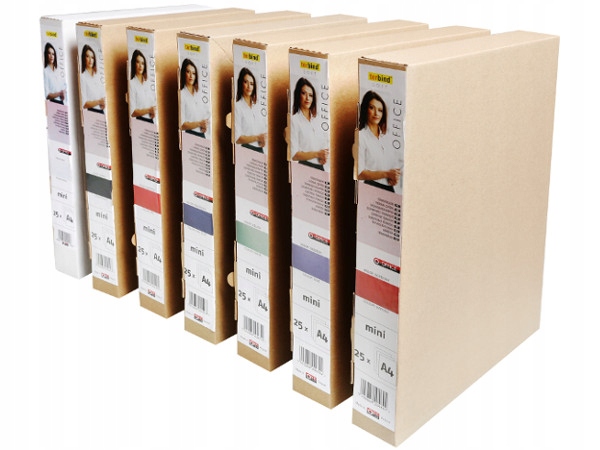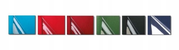 Termookładki kolorowe wykonane z przedniej okładki przezroczystej i tylnej z kartonu o skóropodobnej fakturze dostępne są w poniższych kolorach: czarny, czerwony, niebieski, bordowy, zielony, i granatowy.