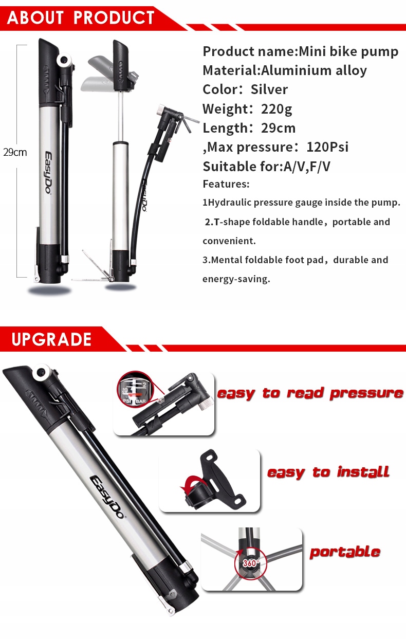 Pompka EasyDo WISDOM-3 120 Psi to uniwersalna i poręczna pompka rowerowa z ogromnym wachlarzem zastosowań! Możliwość wtłoczenia aż do 120 Psi, czyli około 8 Bar pozwala na stosowanie jej zarówno przy rowerach szosowych, jak i MTB oraz motocyklach i hulajnogach elektrycznych. Rozkładana stopka pozwala na postawienie jej na podłożu i wygodniejsze uzupełnianie ciśnienia w swoim sprzęcie. Wisdom-3 zapewnia szybką zmianę wejścia na wentyl z Presta na Schrader i na odwrót! Dzięki czemu napompujemy większość dostępnych na rynku dętek do wszelakich pojazdów elektrycznych lub mechanicznych. Uchwyt na pompkę mocowany do koszyka na bidon pozwala na łatwy transport i posiadanie jej zawsze przy sobie przy dalszych i bliższych eskapadach. Małe wymiary pozwalają na schowanie jej w plecaku lub sakwach.
