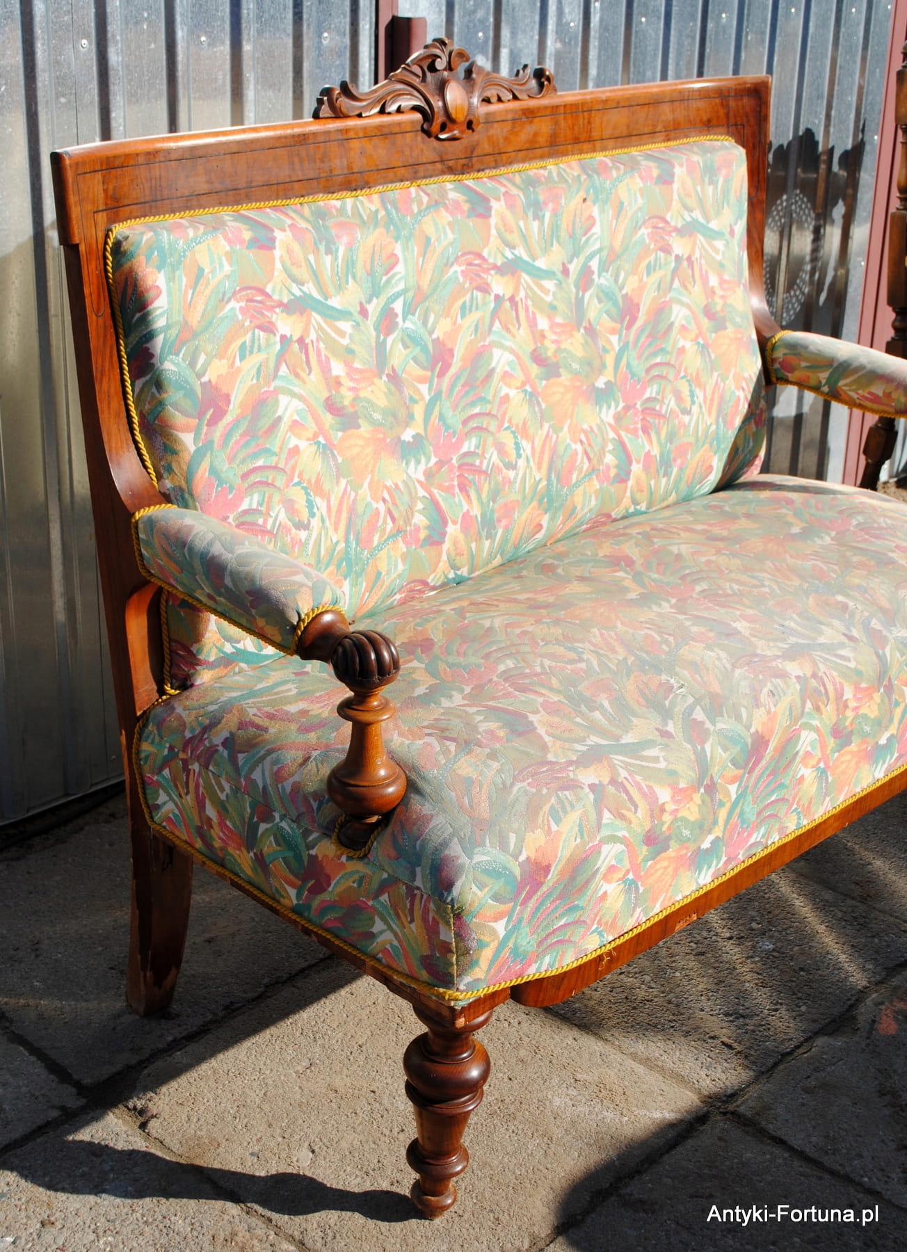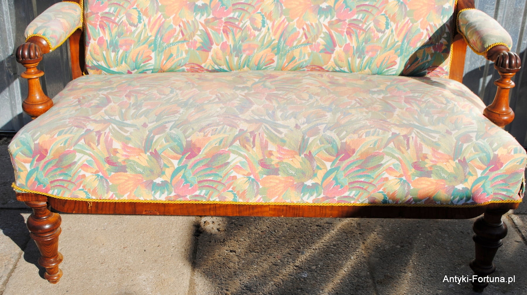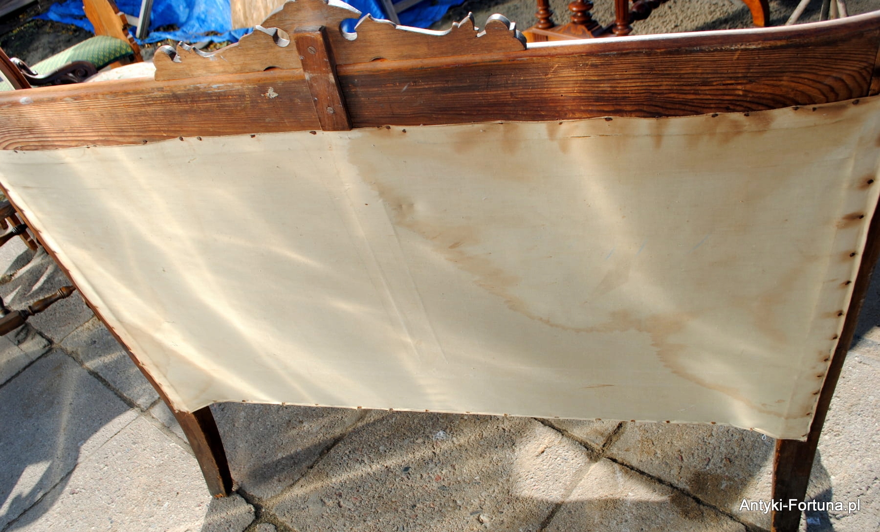 Stara sofka z koroną , stabilna , stan jak na zdjęciach. Delikatne ryski , przytarcia oraz ubytki forniru , była w normalnym użytkowaniu. Obicie w kilku miejscach delikatne przetarcia , więc raczej do wymiany . Wymiary : szer całkow 125 cm, cm gł 47 cm , wys 106 cm , wys do siedziska 49 cm . Na sprężynach .