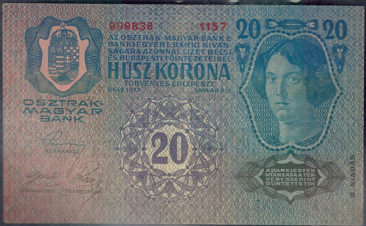 Австрия-австро-венгерский банк, 20 крон, выпуск 2. январь.1913, серия 1157, № 999838