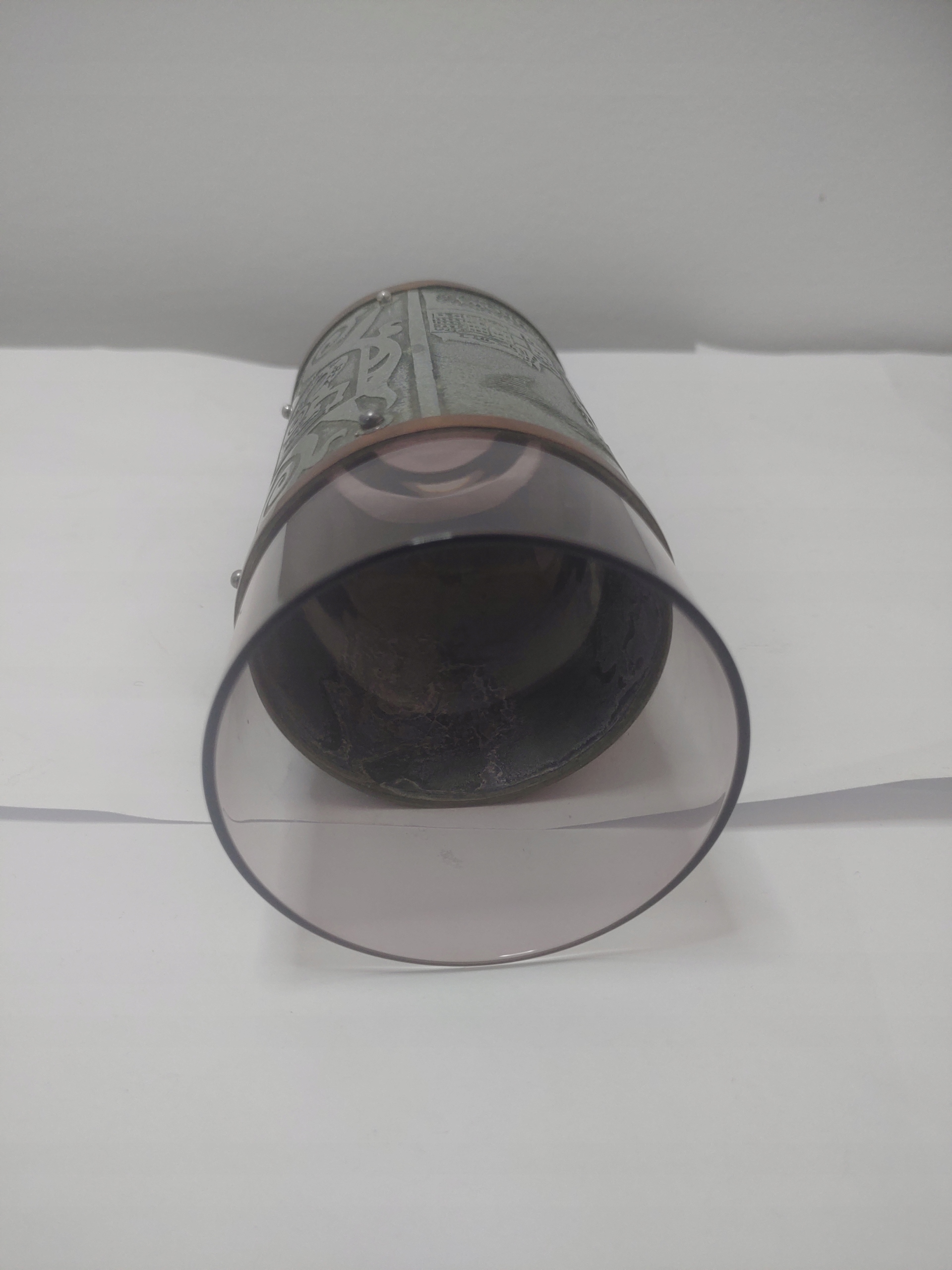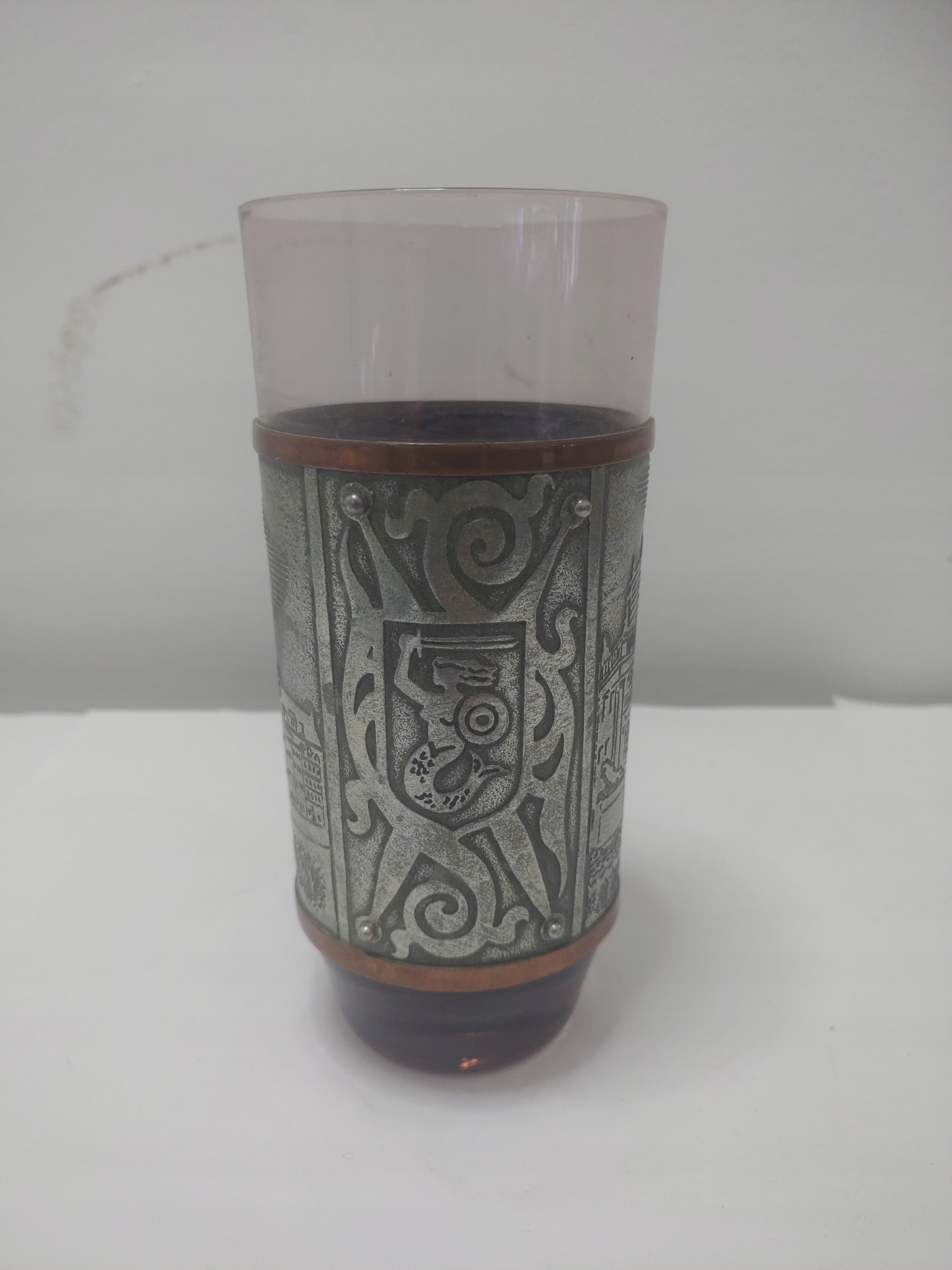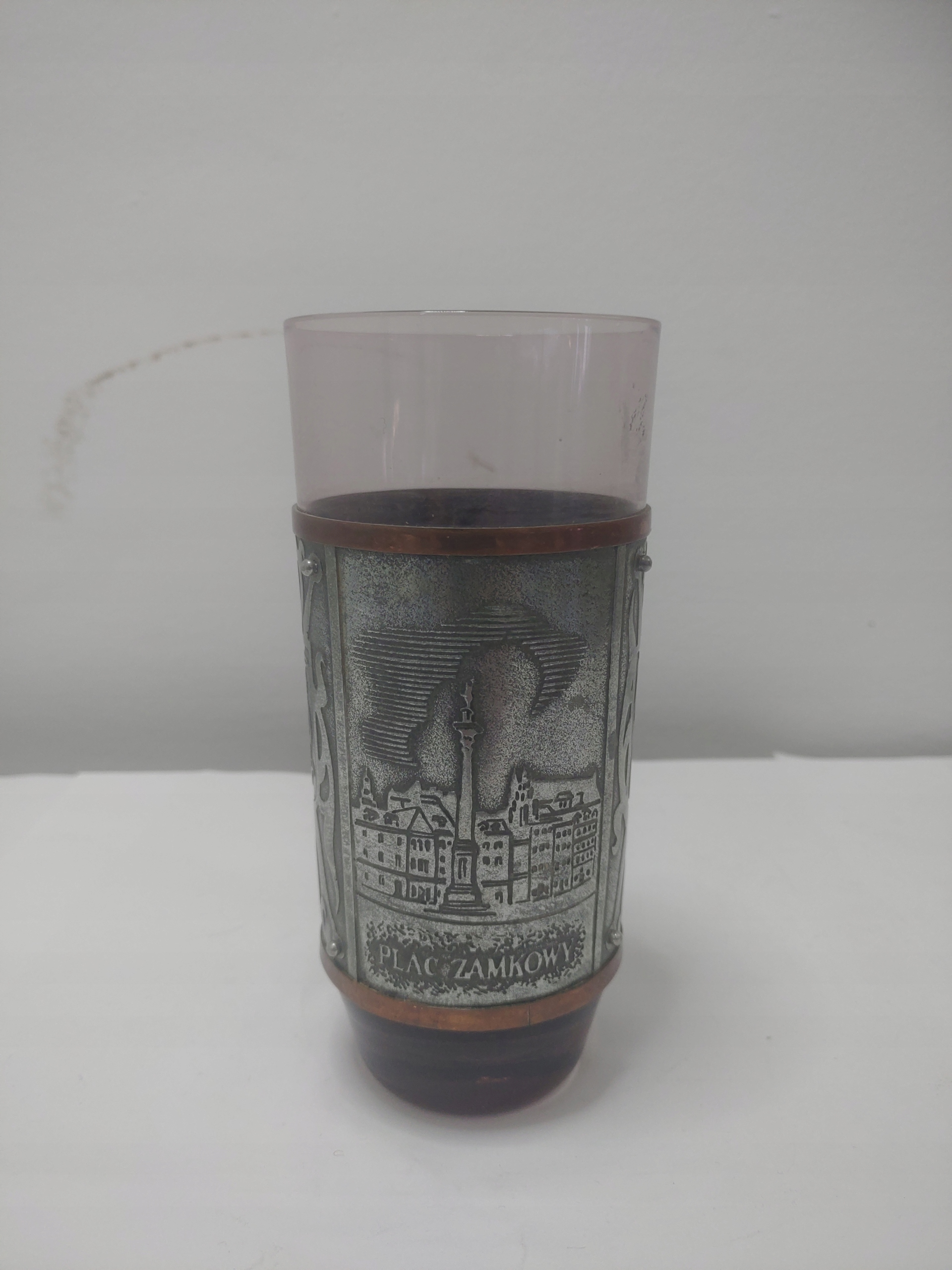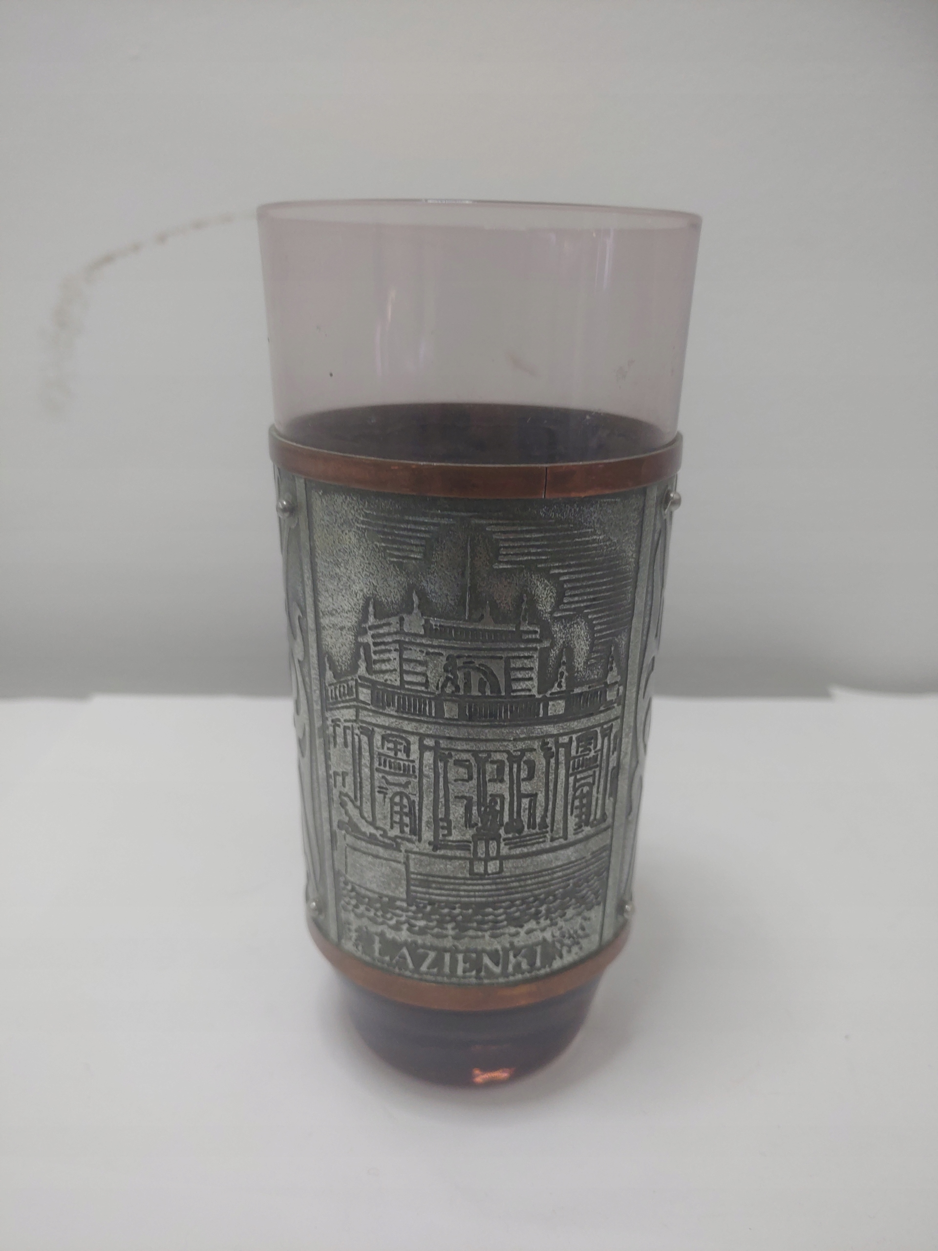 Stare szkło dość delikatne w fioletowym (od jasnego po ciemny) kolorze, barwione w masie. Na szklance szeroka opaska z metalu z dekoracjami przedstawiającymi widoki z Warszawy