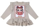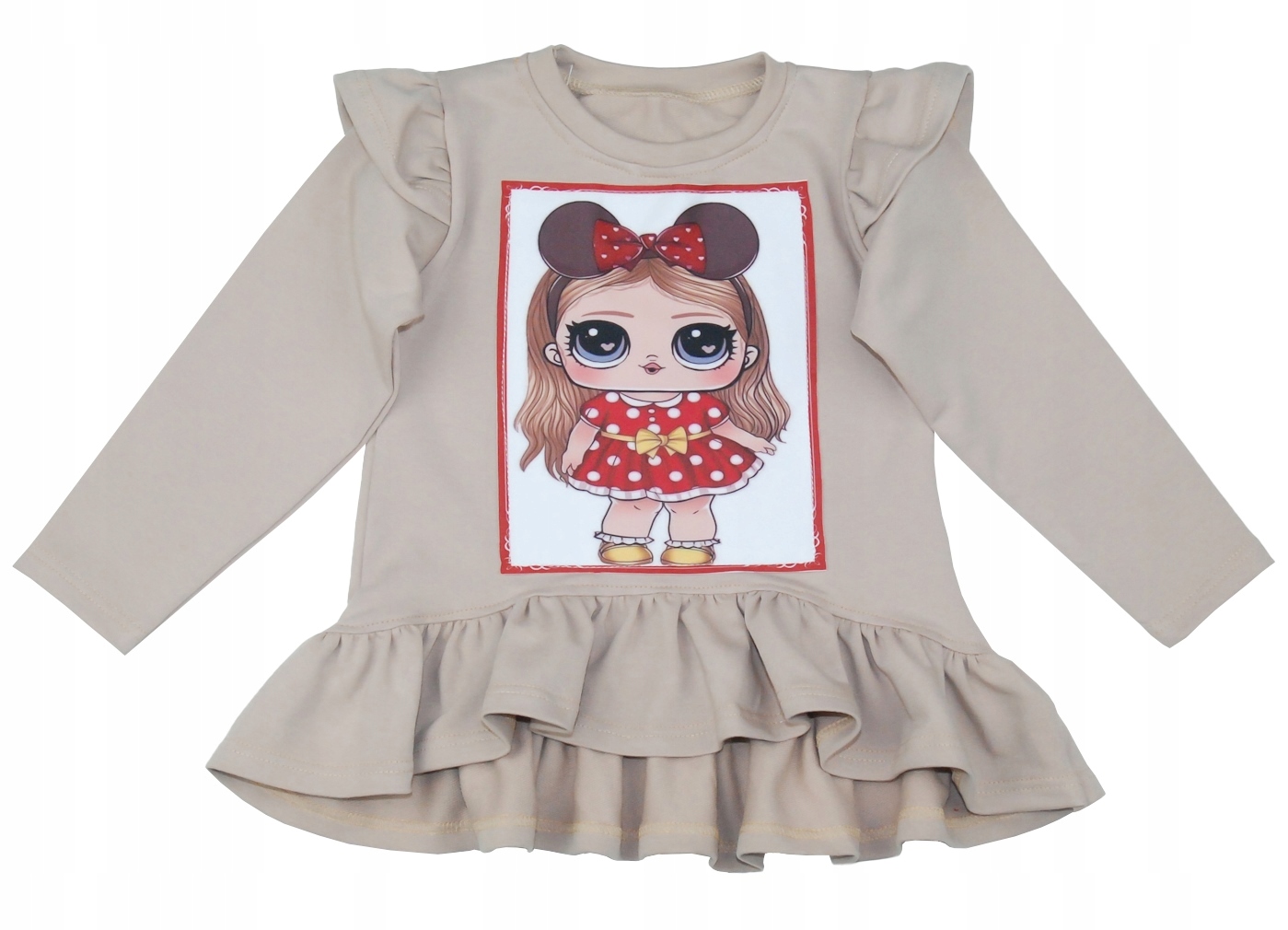 На плечах нашитые оборки, спинка чуть длиннее, низ оканчивается оборкой, спереди пришит экран с девочкой / куколка.