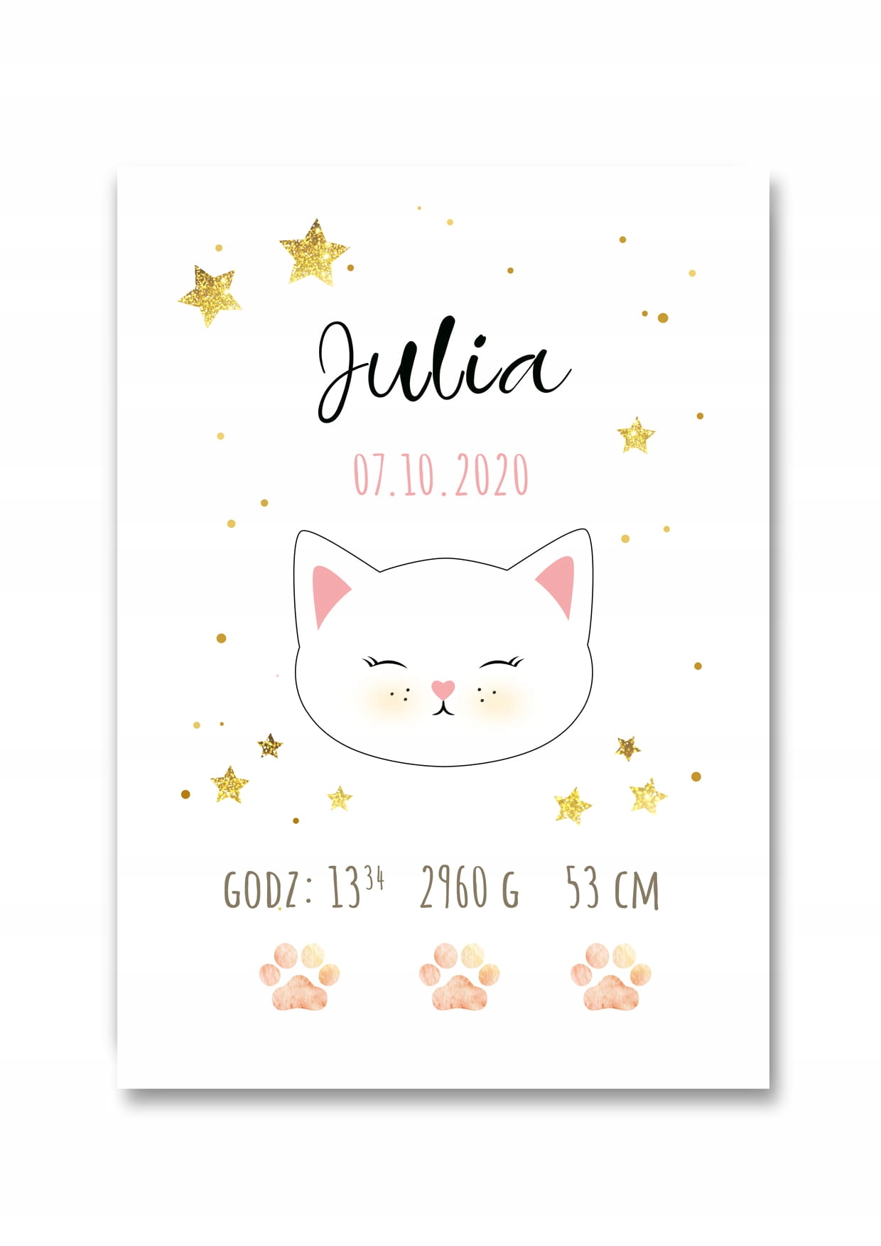 Personalizowana metryczka urodzeniowa dla dziewczynki, na której widnieje piękny motyw kotka i złotych gwiazdek. Na metryczce możemy umieścić takie informacje jak imię dziewczynki oraz jej parametry urodzeniowe – data urodzenia i godzina urodzenia, a także waga i wzrost. Metryczka z kotkiem to doskonała pamiątka do powieszenia na ścianie lub do postawienia na meblach, co ułatwia dołączona do kompletu ramka.