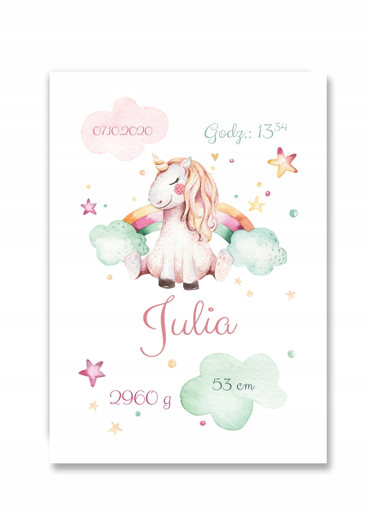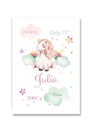 Personalizowana metryczka z motywem jednorożca, która stanowi wyjątkową pamiątkę z momentu urodzin dziecka. Na plakacie umieszczane są takie informacje jak: imię dziewczynki, data i godzina urodzenia, a także podstawowe parametry urodzeniowe: waga i wzrost dziecka. Do plakatu dołączamy ramkę, dzięki której metryczkę można powiesić na ścianie w pokoju dziecięcym lub postawić na półce.