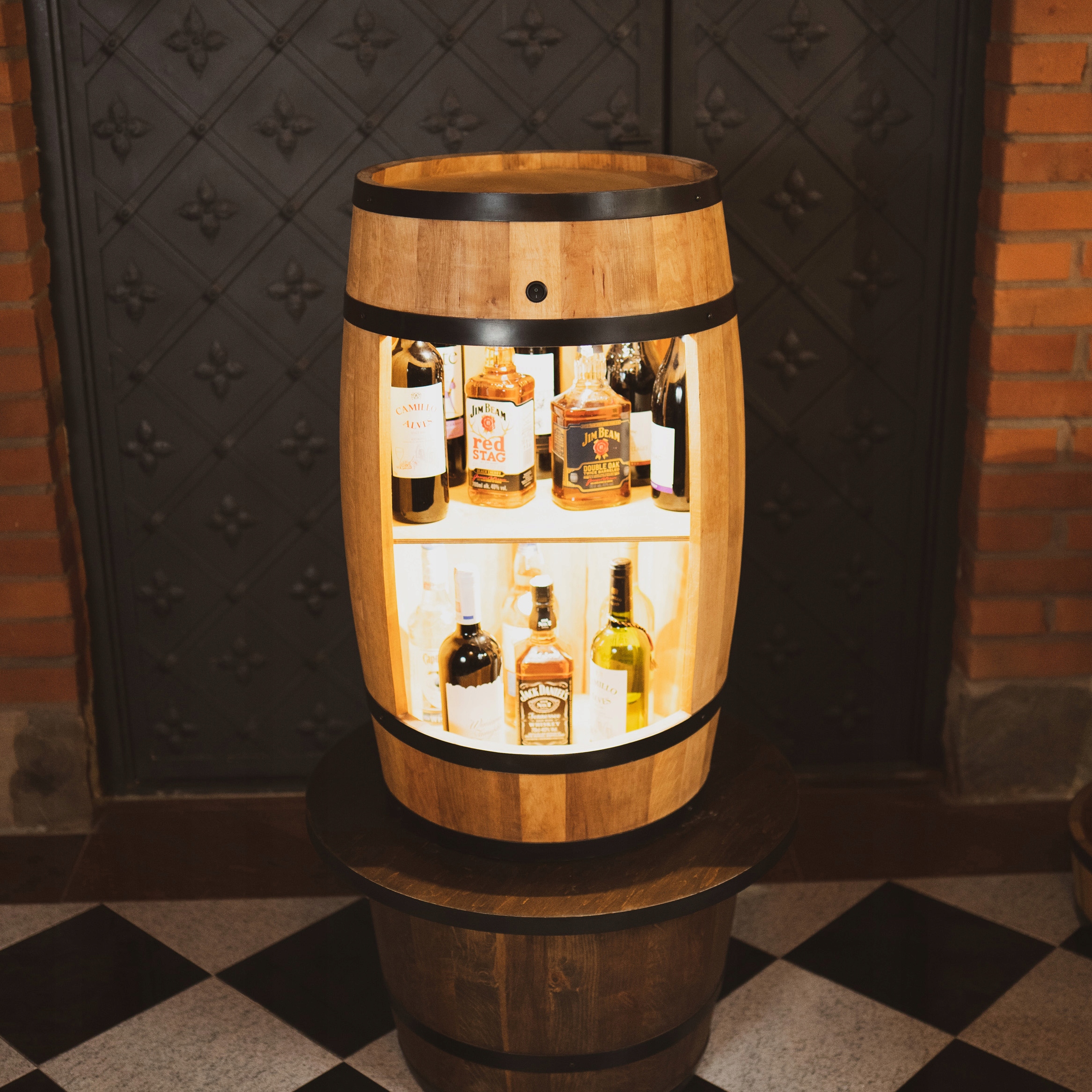 Podświetlenie zamontowane w beczce zasilane jest 8 bateriami AA. Dzięki zastosowniu światełek LED możemy zajrzeć w zakamarki naszego barku i wybrać idealny trunek na daną okajzję.