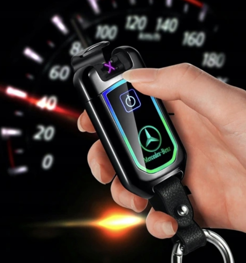 Zapalniczka plazmowa z akumulatorem, ładowana przez port USB, odpalanie na dotyk z logo Mercedes-Benz.