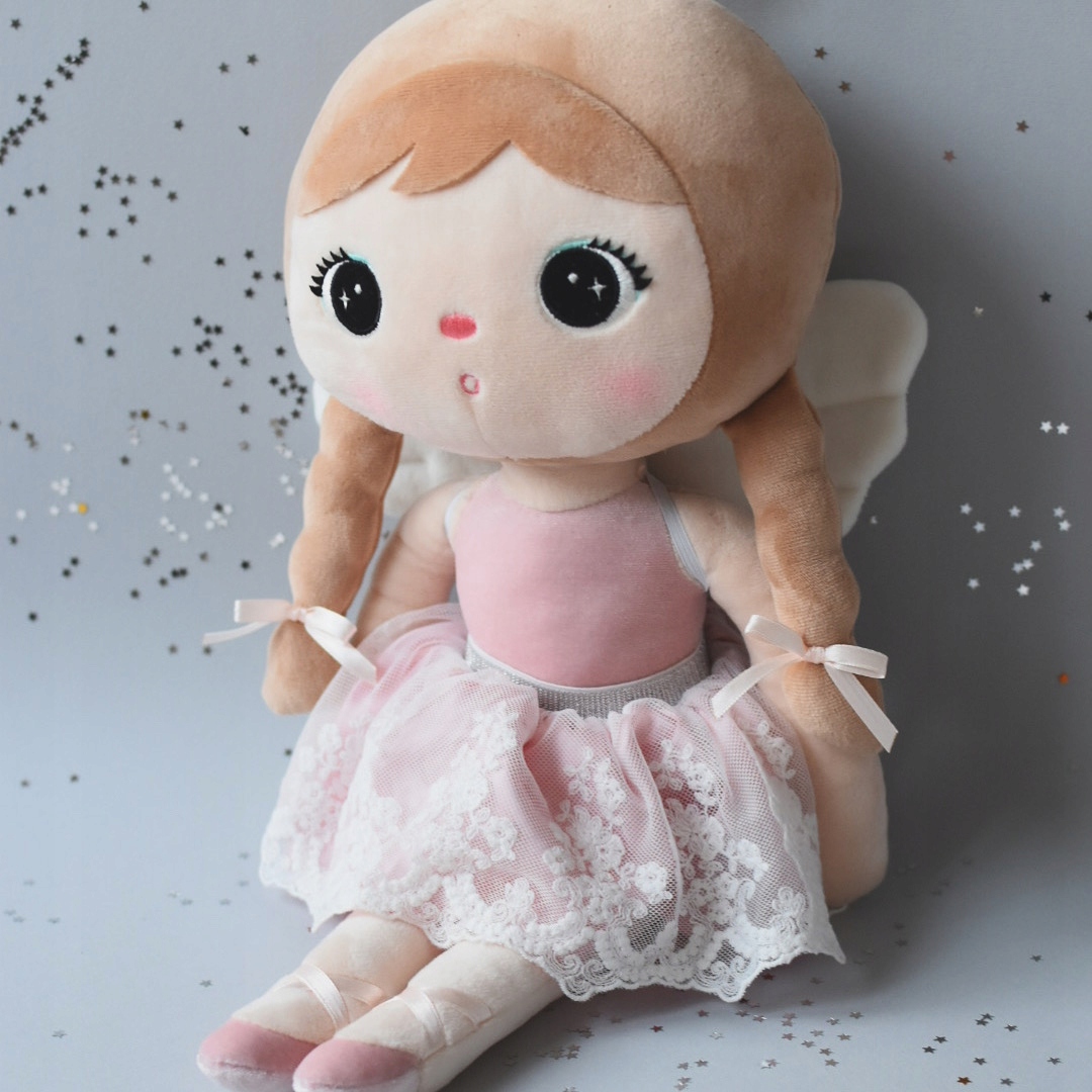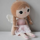 Wygląd Boho Lalki Metoo w przebraniu Aniołka uzupełniają elementy, które pokochają małe dziewczynki- błyszczące, różowe baletki, koronkowa spódniczka, welurowe body w kolorze pastelowego różu i dwa słodkie warkoczyki.