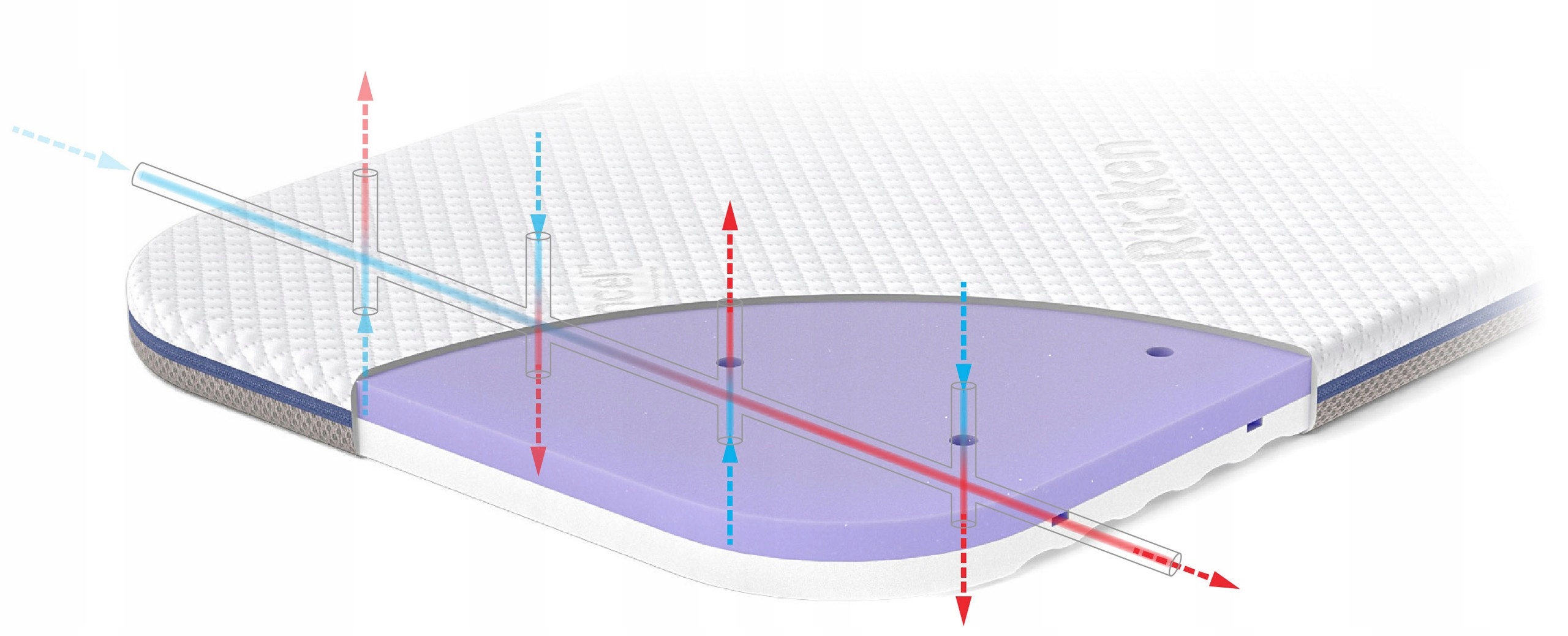 Вентиляционные каналы, расположенные на спальной поверхности, интегрированы в вертикальные канальцами, проходящими через толщину матраса, и канальцами, вырезанными внутри вставки. Это связь имеет решающее значение, потому что только тогда мы можем быть уверены в лучшей циркуляции, а также в матрац.