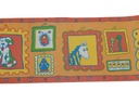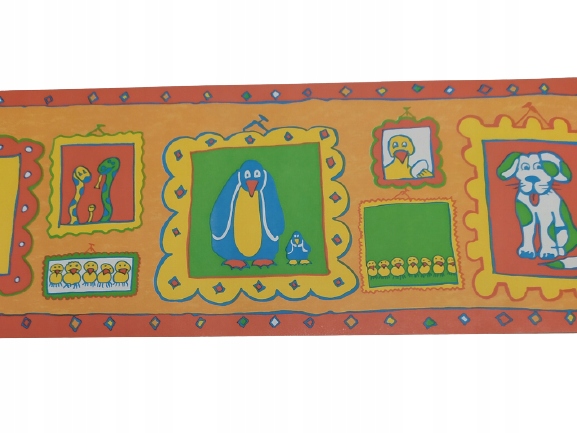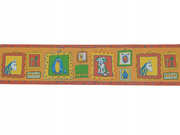 Wzór: Wielobarwna galeria obrazów ze zwierzątkami na pomarańczowym tle. Brzegi czerwone.