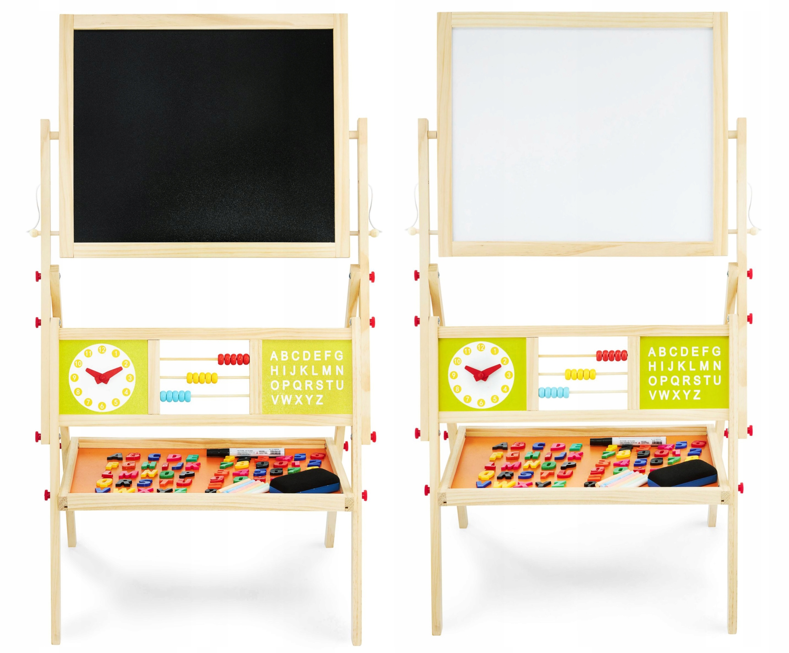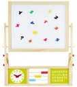 Pod tablicą umieszczono liczydło, dzięki któremu dziecko może poznawać podstawy matematyki oraz zegar, który pomoże w nauce odczytywania godzin. Nie zabrakło również praktycznej półeczki na akcesoria.