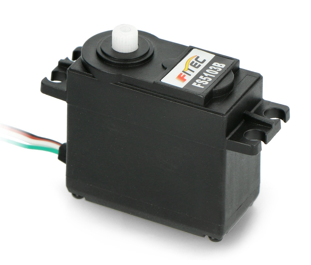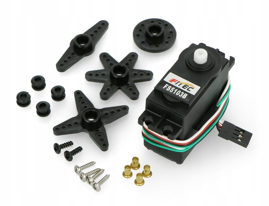 Serwomechanizm Feetech FS5103B-FB, jest to specjalnie zmodyfikowana wersja analogowego serwa FS5103 zapewniająca dostęp do wbudowanego potencjometru poprzez dodatkowo wyprowadzony zielony przewód, takie rozwiązanie umożliwia bezpośredni pomiar kąta wyjściowego. Kąt pracy wynosi od 0° do 180° w zakresie impulsów do 600µs do 2400µs.