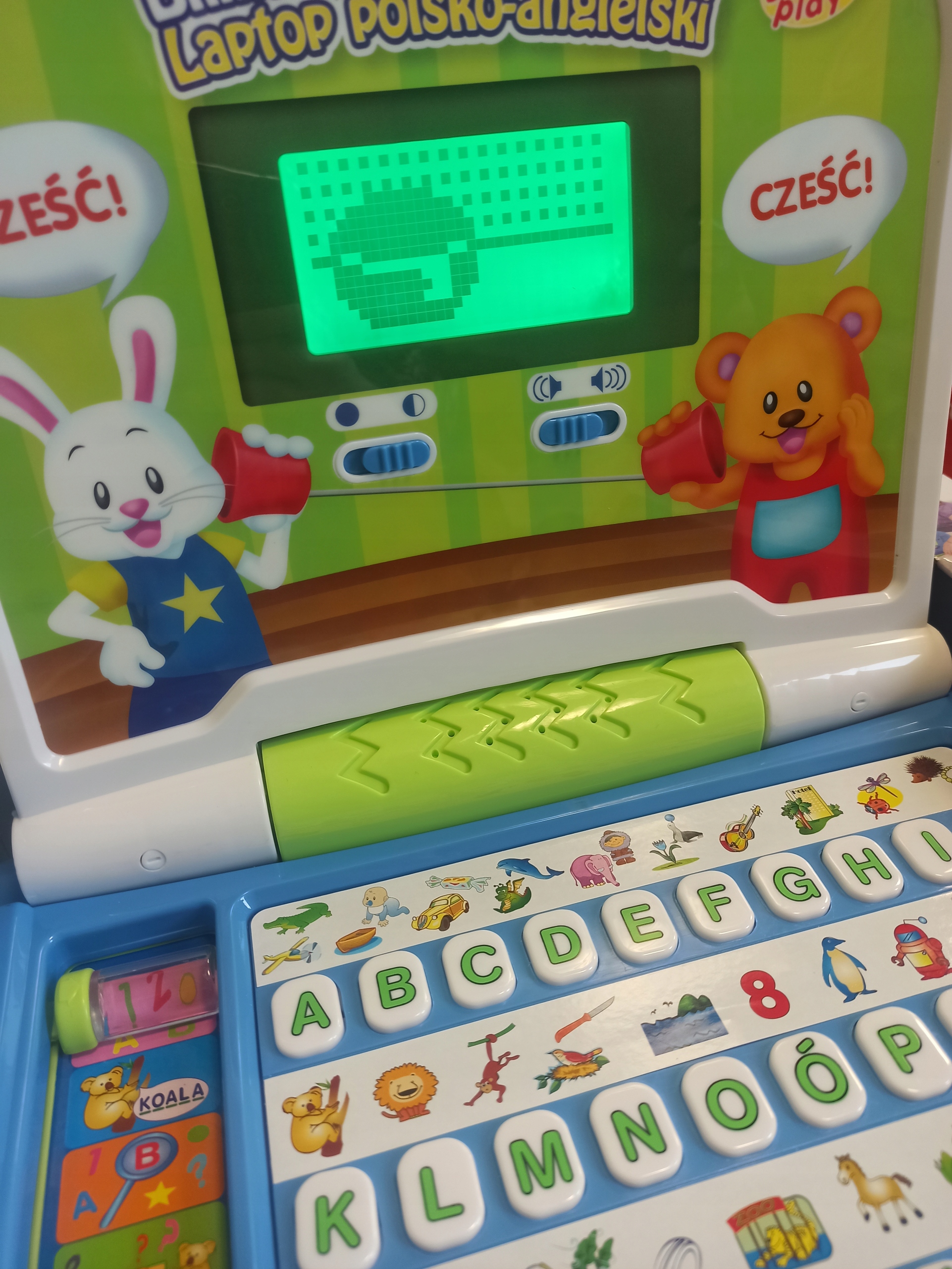 Wygląda zupełnie jak prawdziwy! Do wyboru 6 zabaw w dwóch językach. Laptop prosi o wykonanie zadań i ocenia ich poprawność. W razie niepowodzenia podaje prawidłową odpowiedź.