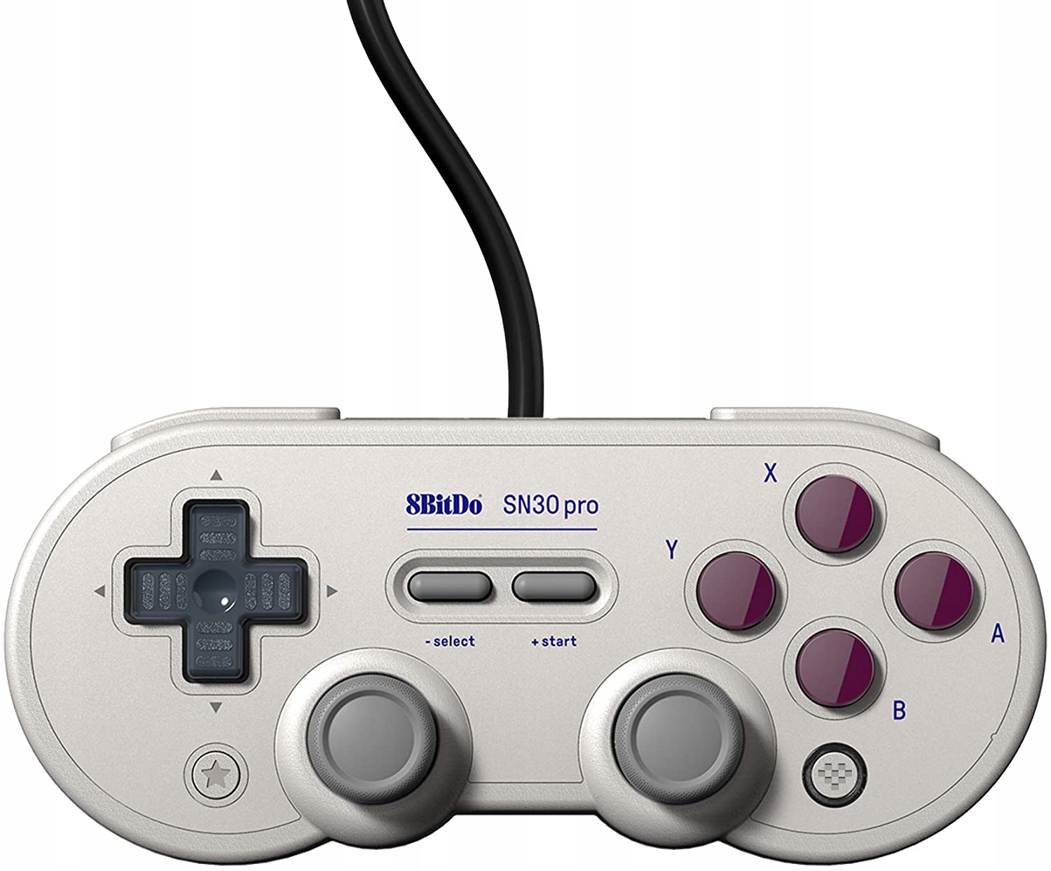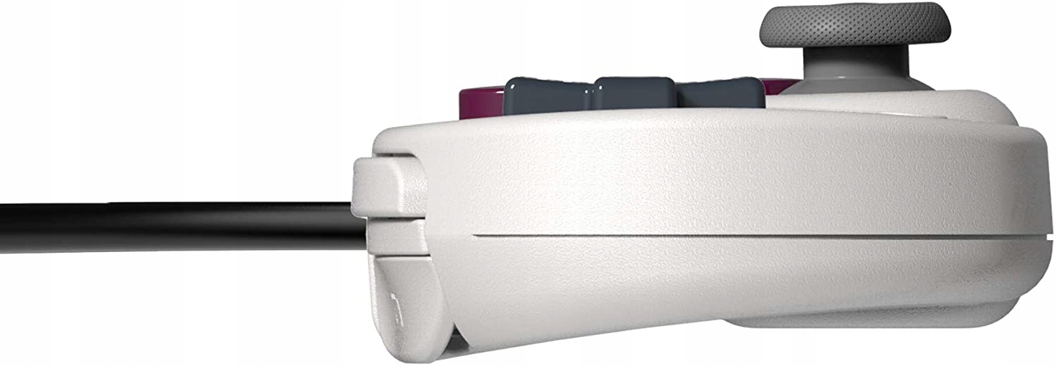 Nowoczesny i wszechstronny przewodowy gamepad USB z dwoma analogowymi gałkami, precyzyjnym krzyżakiem i wibracją, zaprojektowany w kolorystyce nawiązującym do klasycznej konsolki Nintendo Gameboy.