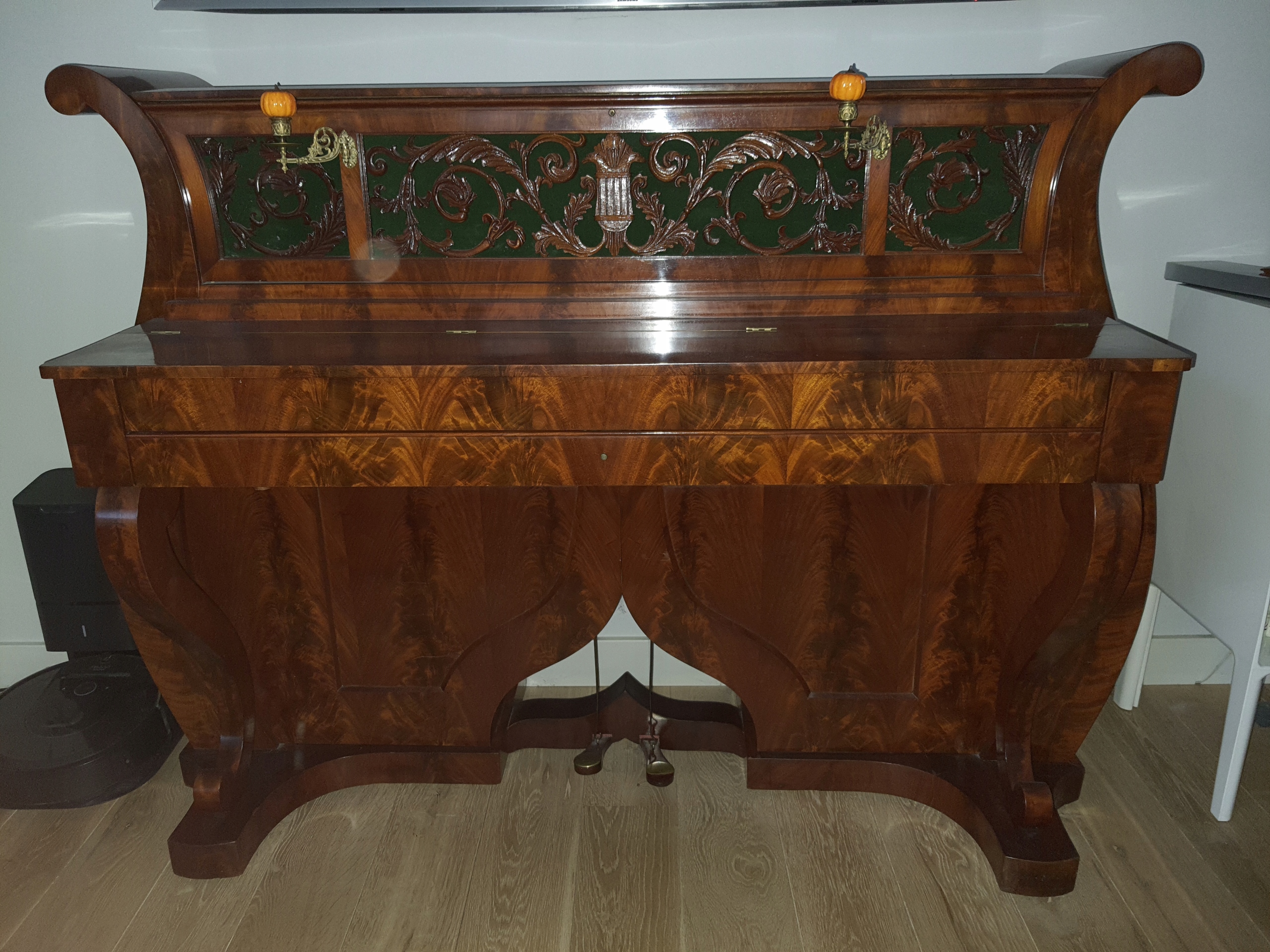 Очень редко появляющееся в продаже пианино Лира Генрих Ролофф чья ставка была тогда очень высоко ценился. Отличительная особенность фортепиано из мастерской Ролоффа Нойбранденбург был открытым фасадом деки с натянутой тканью изящный резчик.