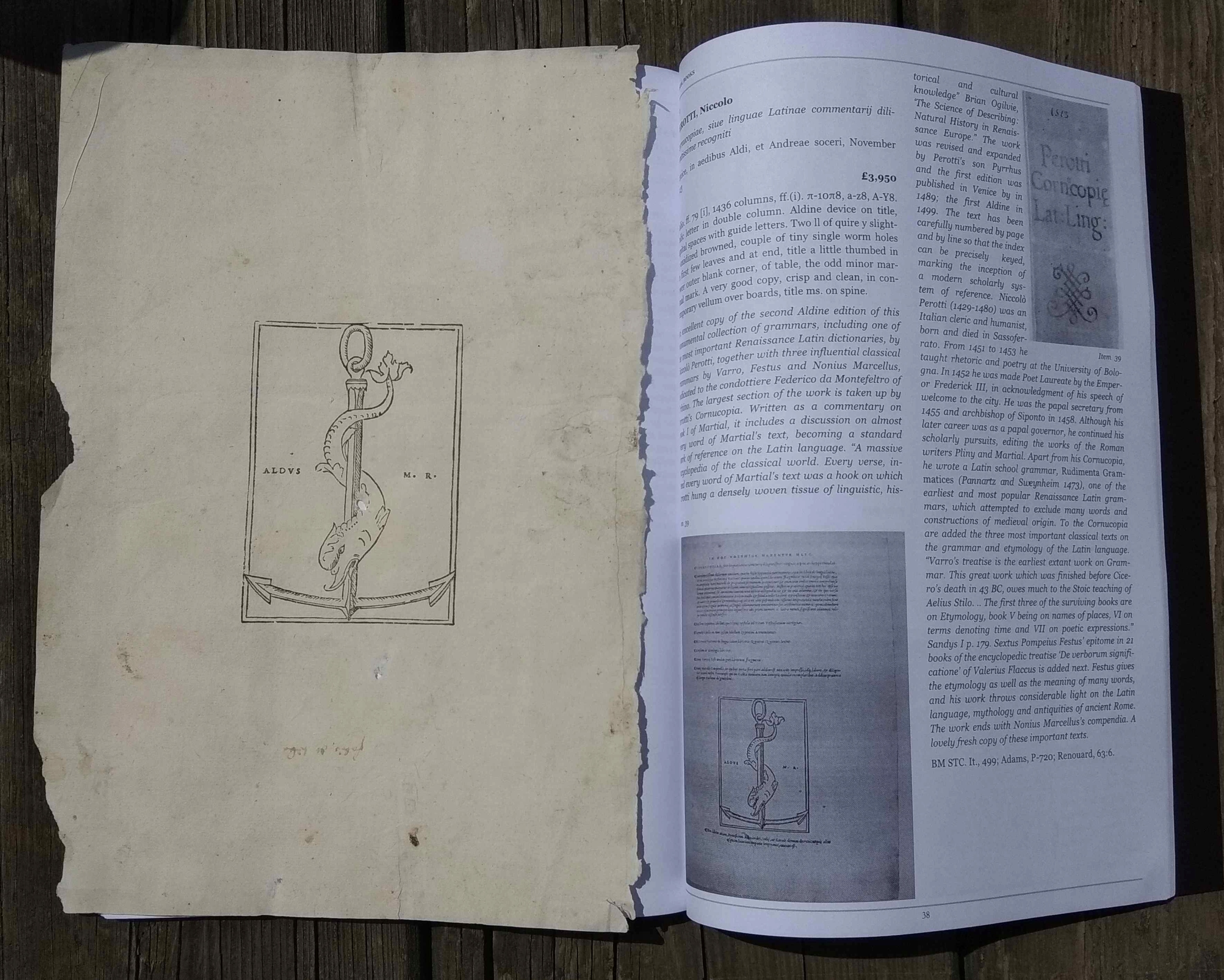 Dzieła Aldusa są tak poszukiwane, że organizowane są aukcje na których sprzedaje się tylko dzieła z jego drukarni. Nabywca otrzyma katalog takiej aukcji, która odbyła się w Wielkiej Brytanii – oprawiony wydruk z opisami dzieł Aldusa i cenami wywoławczymi. Druk z 1513 roku, z którego pochodzi oferowany sygnet był wystawiony na aukcji z ceną wywoławczą 3.950 funtów.