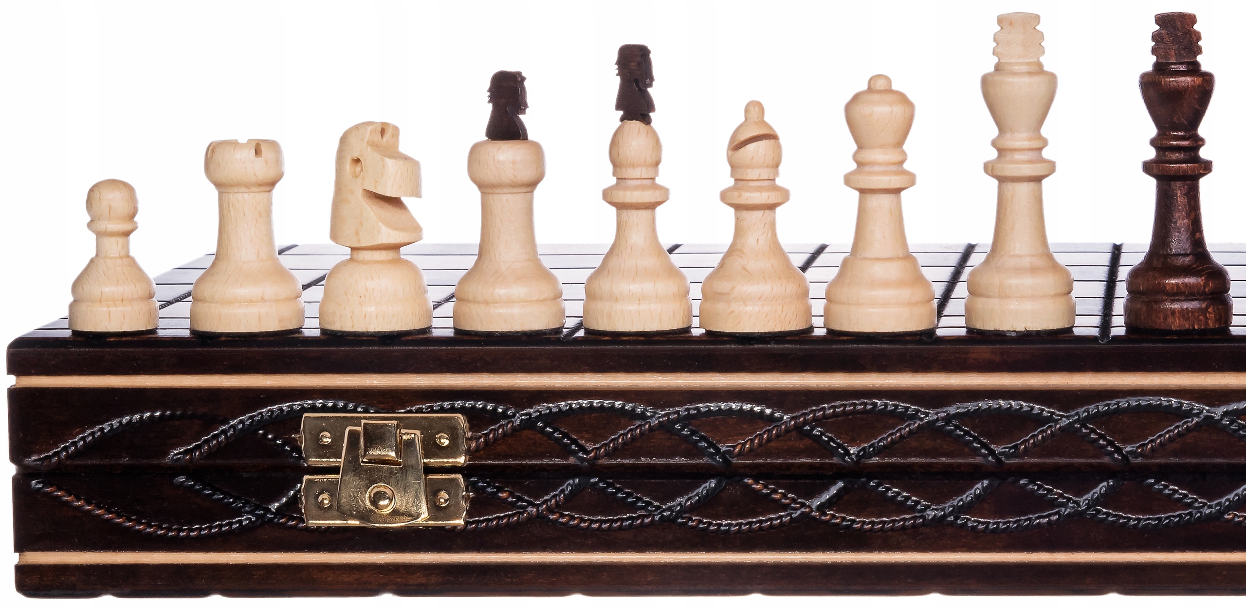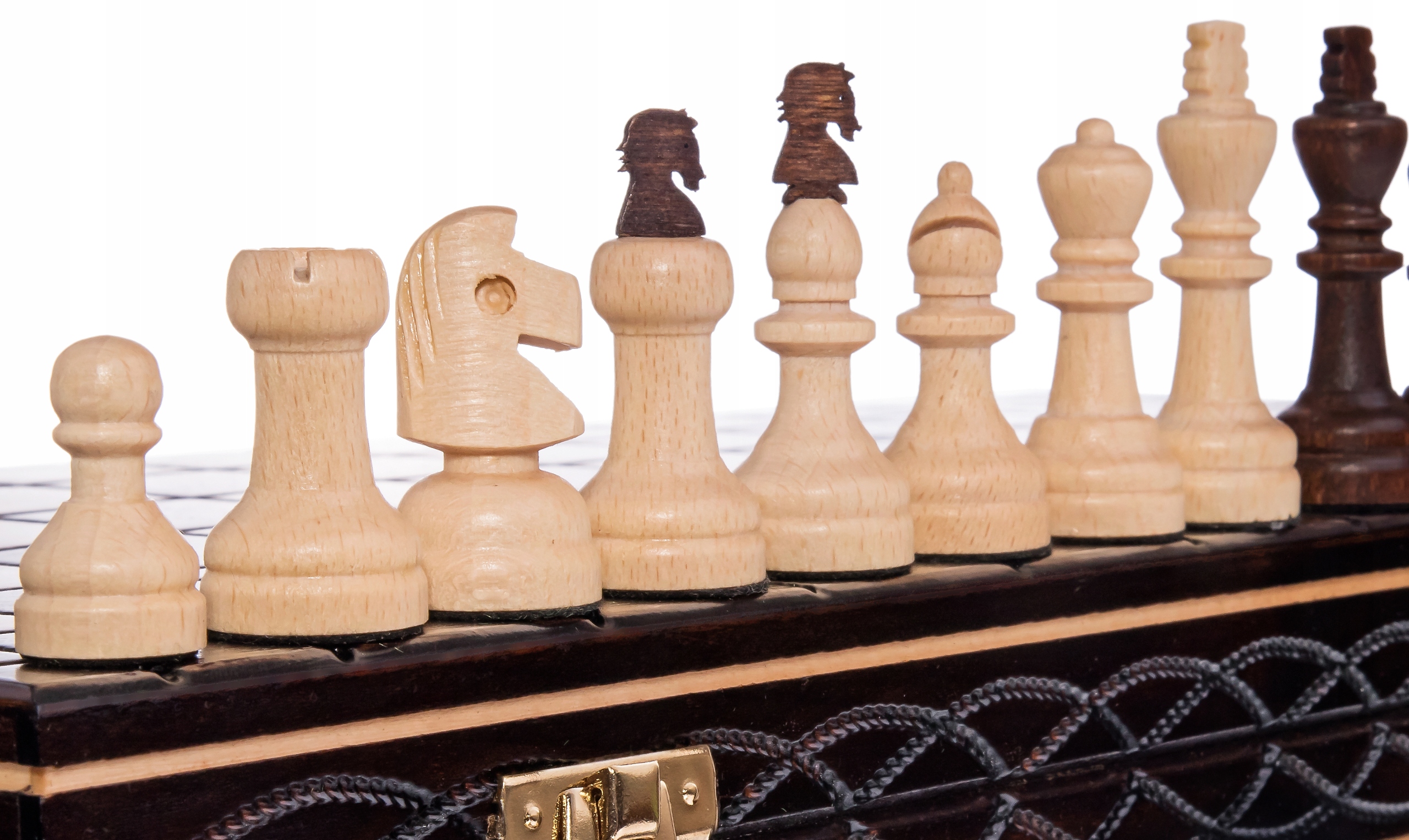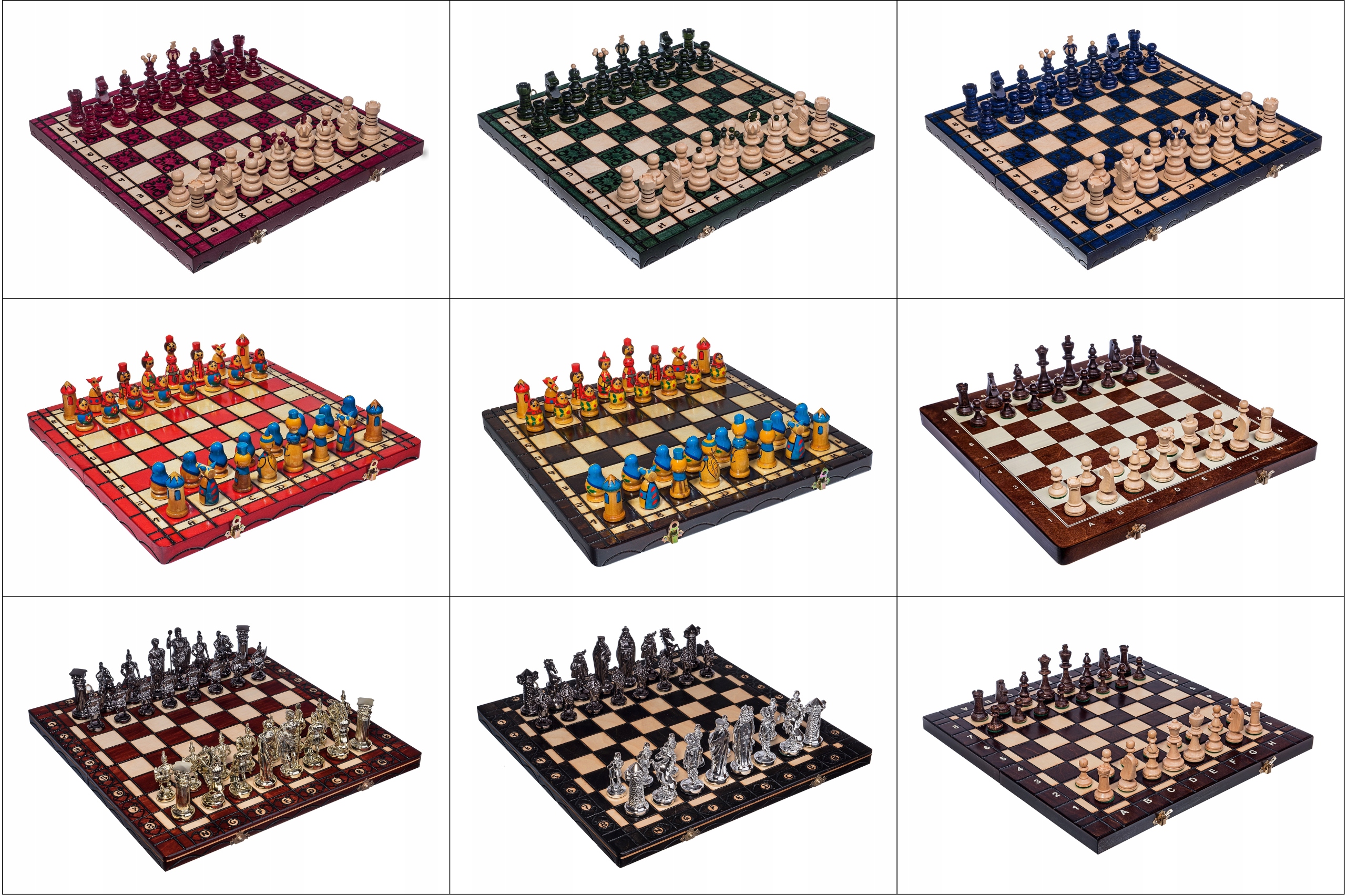 Każda szachownica jest zapakowana w tekturowe pudełko.