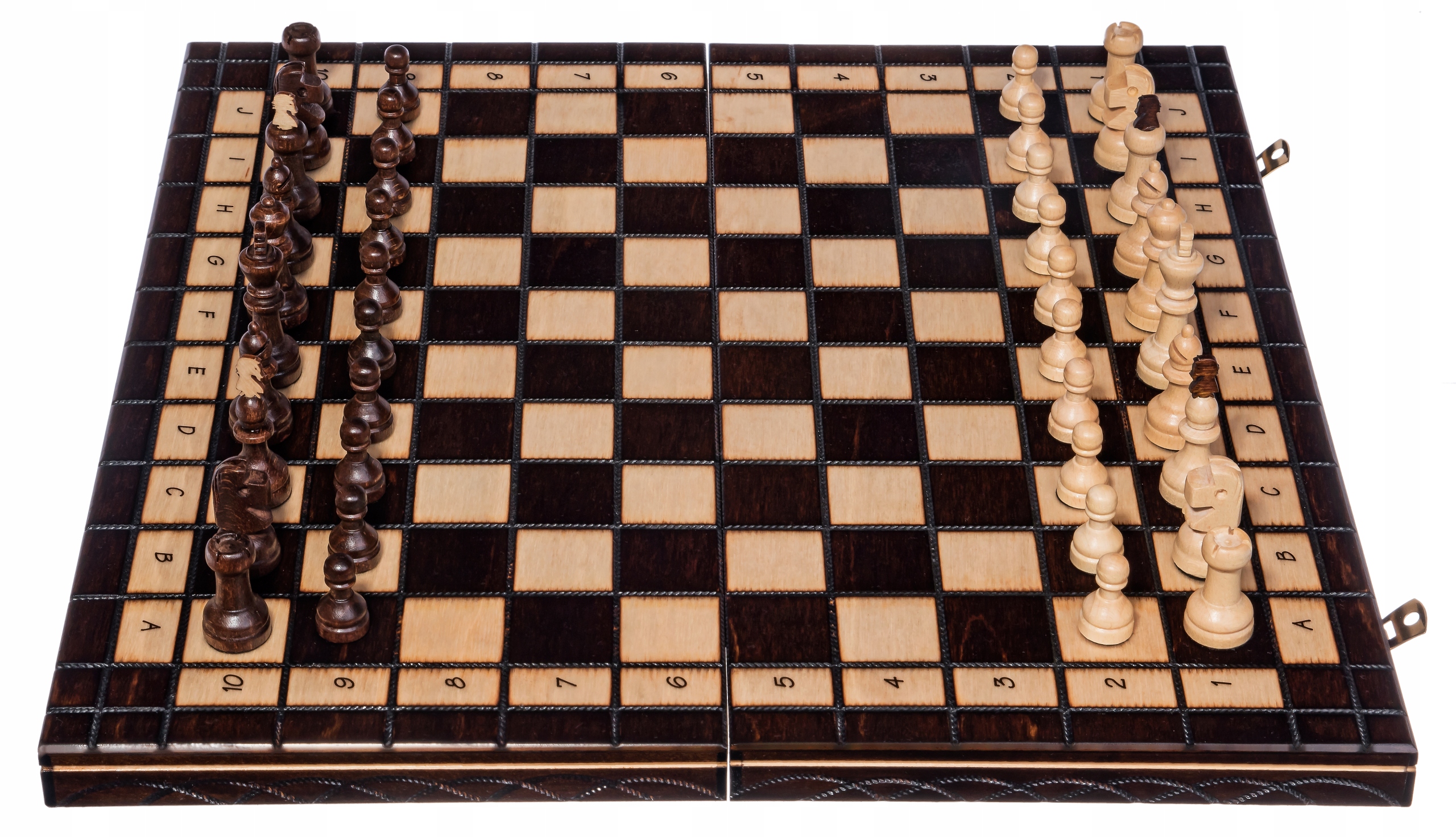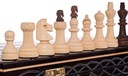 Rozłożona szachownica ma wymiary 40 x 40 x 2,5 cm, po złożeniu stanowi pudełko, w którym można przechowywać figury szachowe.