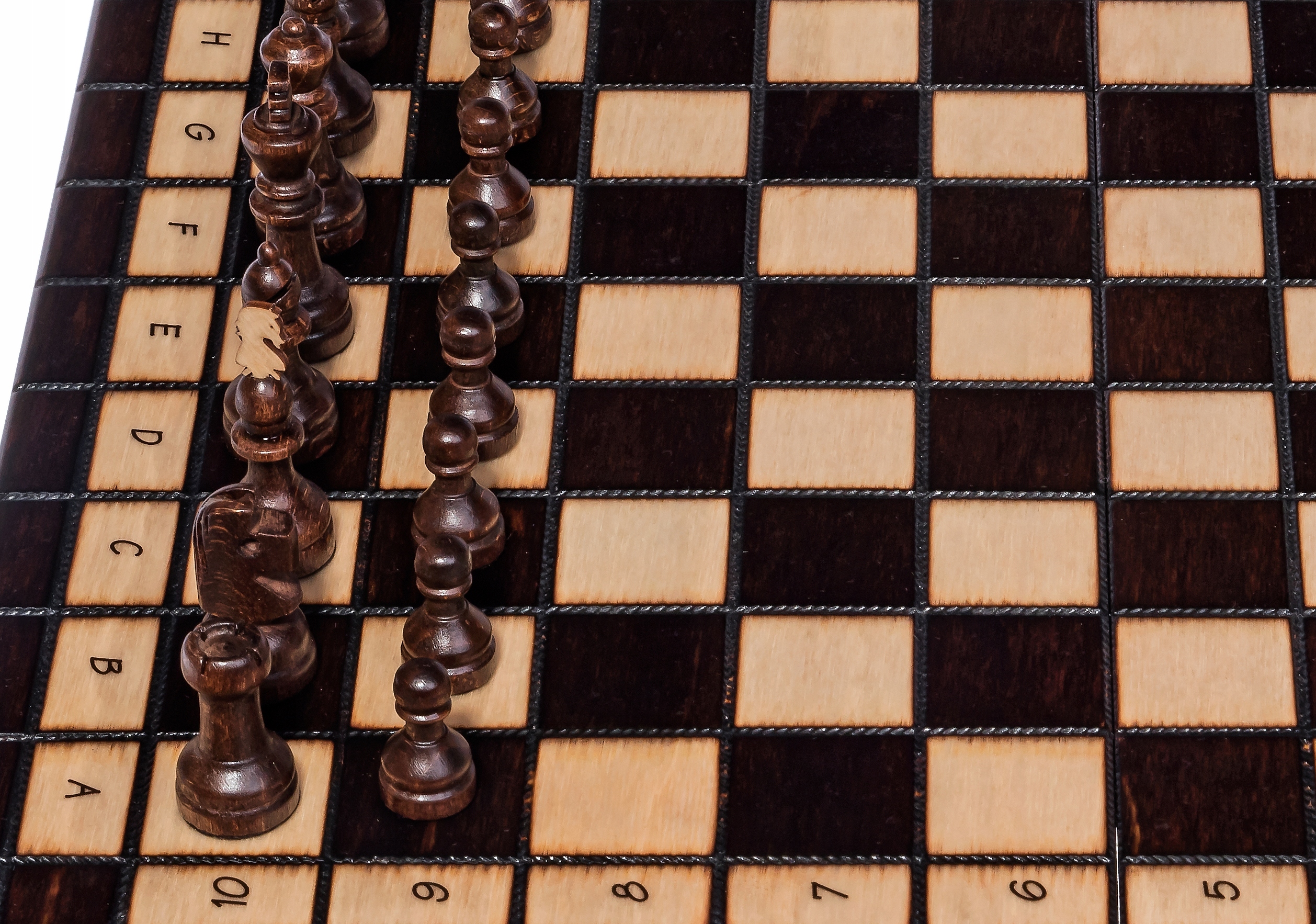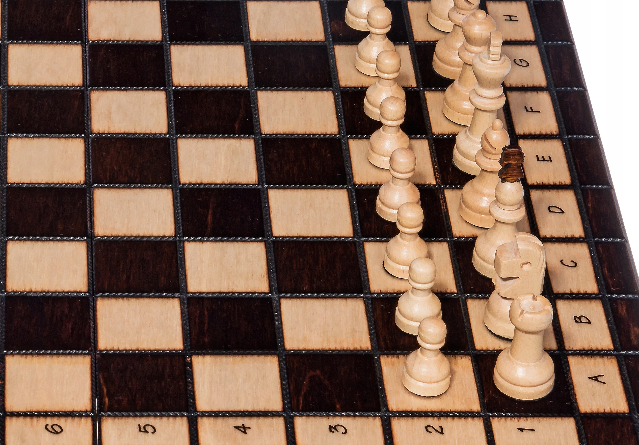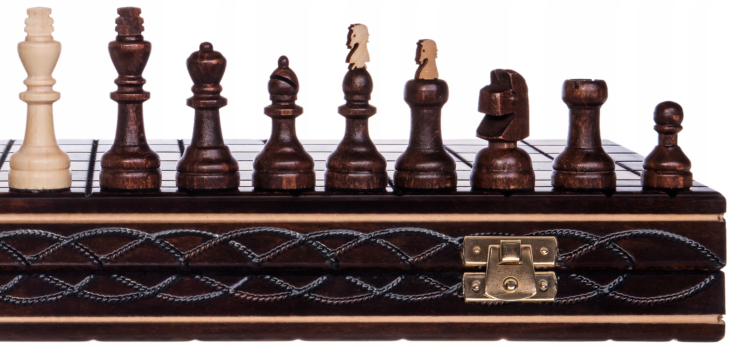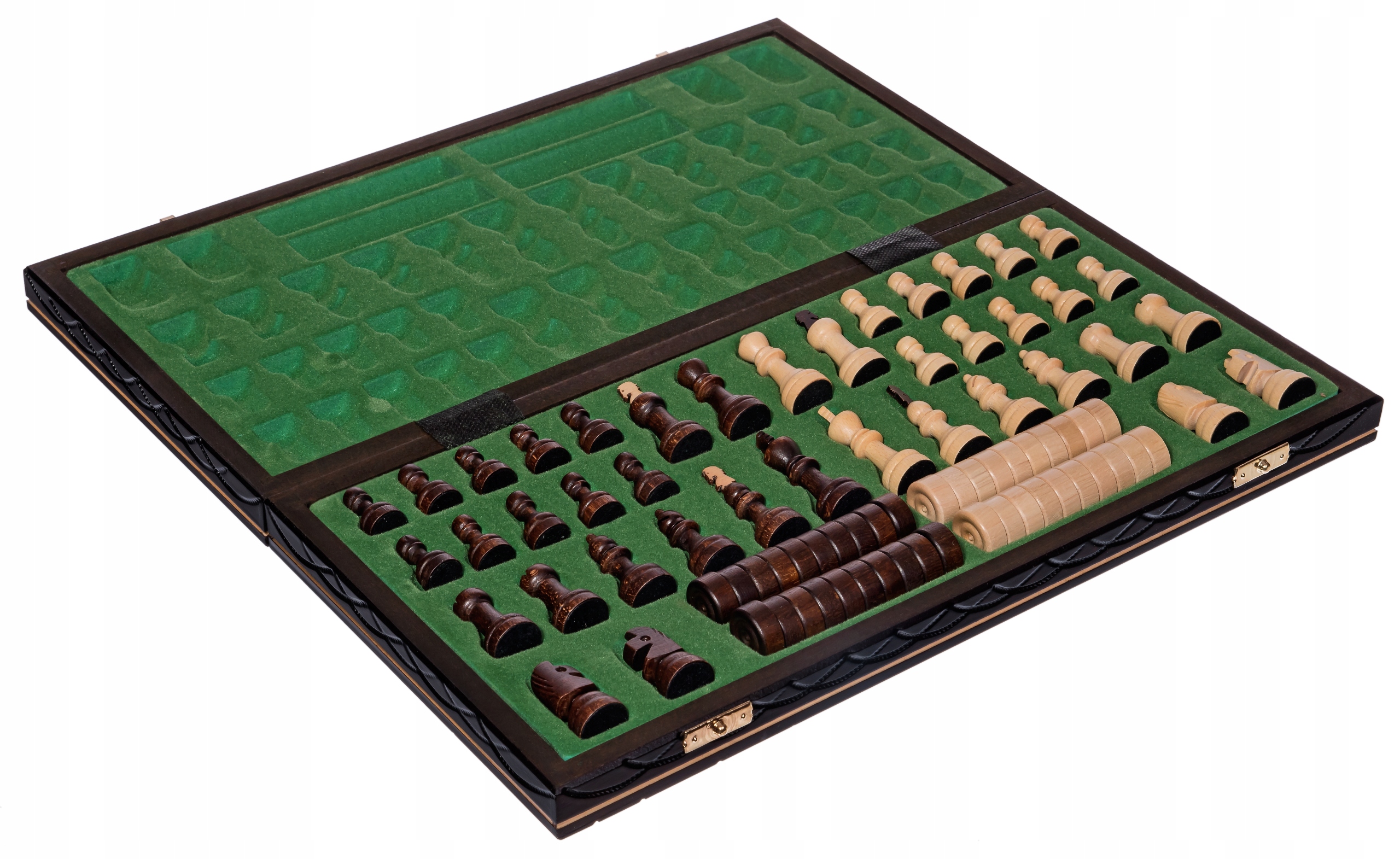 В центре шахматной кассеты находится стелька покрыта флоком, благодаря которому каждая фигура и пешка имеет свое место, что обеспечивает их от механических повреждений.