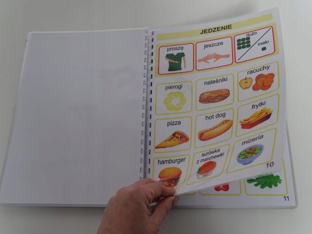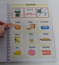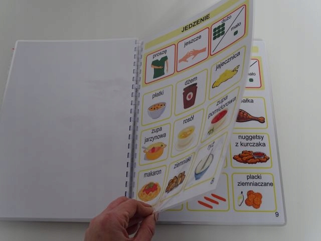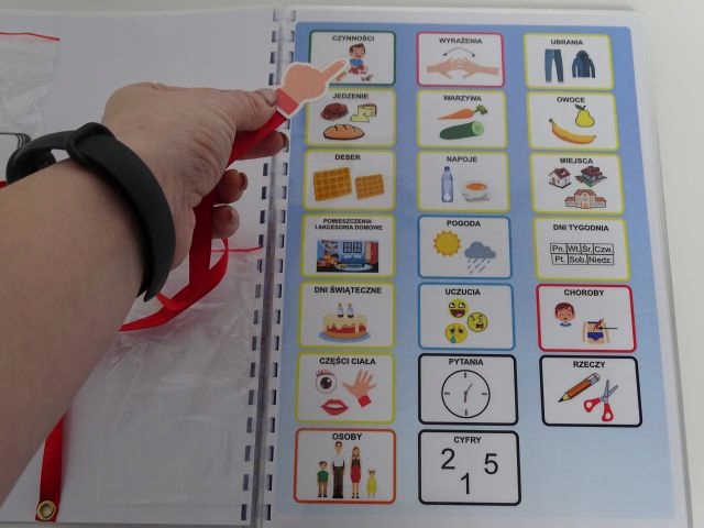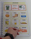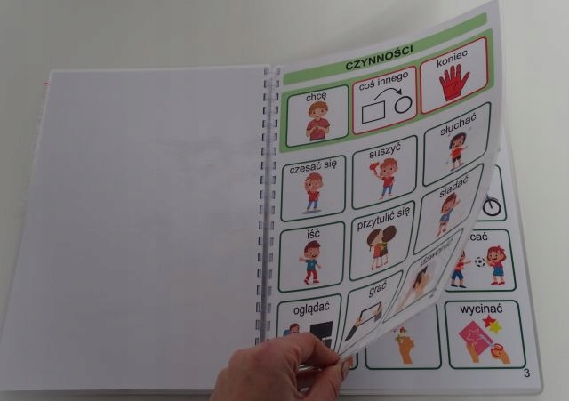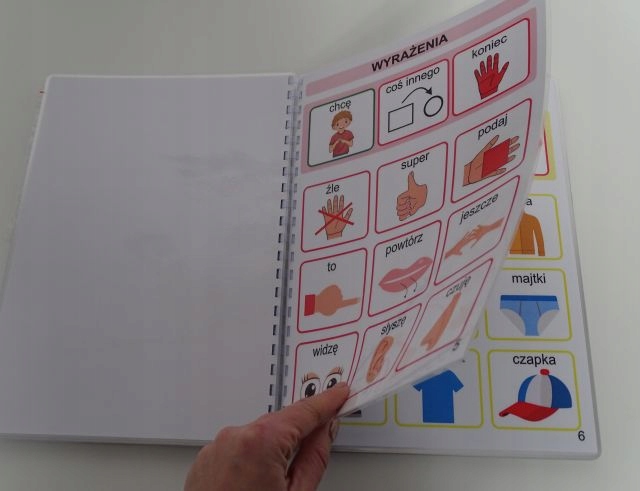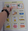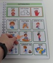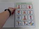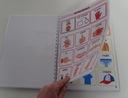 Książeczka w formacie A4 zawiera 33 szt. kart aktywności jednostronnych, na każdej karcie na pasku zadaniowym pomocnicze wyrażenia oraz 9 obrazków z danej kategorii. Dzięki temu wszystko jest czytelne bez nadmiaru obrazków, a dziecku łatwiej się odnaleźć. Książka zawiera łącznie 279 szt. piktogramów + 24 szt. pustych okienek ( na własne potrzeby). W zestawie również 2 metry rzepy haczyk i pętelka w celu samodzielnego przyklejenia dodatkowych piktogramów, które chcielibyśmy dołączyć do naszej książeczki lub bliskie osoby z kategorii osoby.