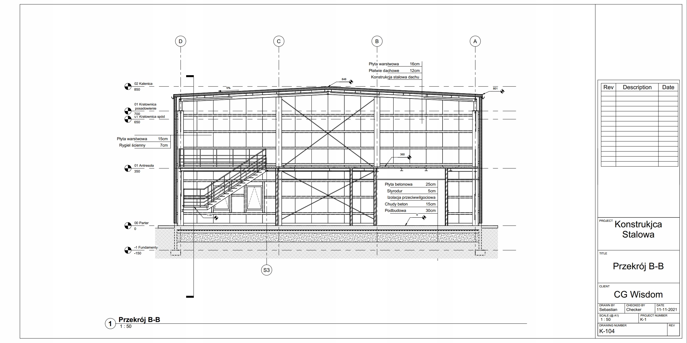 Na początku zajmiemy się przygotowaniem do pracy, czyli utworzymy nowy arkusz oraz ustawimy go wedle naszych potrzeb. Następnie zaczniemy etapami modelować konstrukcję stalową, zaczynając od elementów pionowych, poprzez elementy poziome, kończąc na elementach konstrukcji dachu. Kiedy będziemy mieć już w projekcie główną konstrukcję, zajmiemy się jej uszczegółowieniem. Kolejnym etapem będzie utworzenie ściany elewacyjnej z płyt warstwowych w którą wstawimy drzwi i bramy wjazdowe, oraz dachu ze świetlikami. Na koniec modelowania zajmiemy się wnętrzem hali, wstawiając w niej ściany działowe, klatkę schodową i sufit podwieszony.