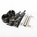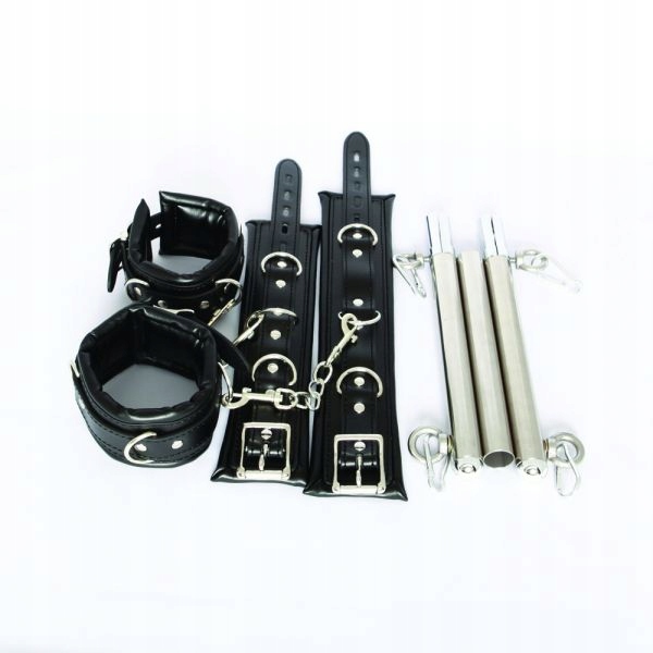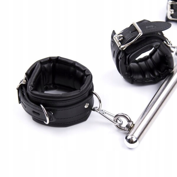 Стальная стойка. Очень прочная и прочная. Складная стойка, позволяет обездвижить одновременно ноги и руки в разных положениях. Стойка состоит из трех соединенных трубок, можно совместить только два крайних, получив распорку длиной 42 см. Для стойки крепятся крепкие наручники на руках и ногах. Наручники сделаны очень аккуратно. Они мягкие и очень удобно использовать. Стойка имеет длину 63cm - может быть расширена примерно до 70cm оставаясь стабильным и прочным.