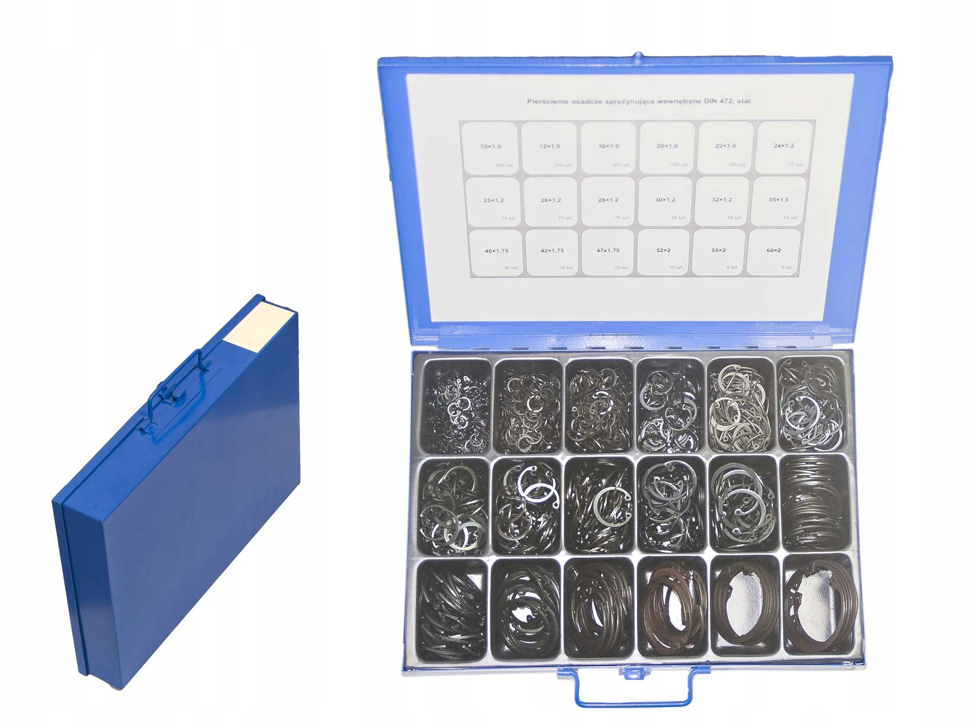 Pierścienie osadcze sprężynujące wewnętrzne w/g DIN 472 w poręcznej metalowej kasecie, co jest idealnym rozwiązaniem w przypadku zapotrzebowania większej ilości pozycji asortymentowych w jednym opakowaniu. Rozwiązanie to jest szczególnie przydatne w warsztatach naprawczych, serwisach czy w sprzedaży detalicznej. Towar w kasecie jest umieszczony w gniazdach i posegregowany według wielkości, co umożliwia jego szybkie i wygodne zlokalizowanie.