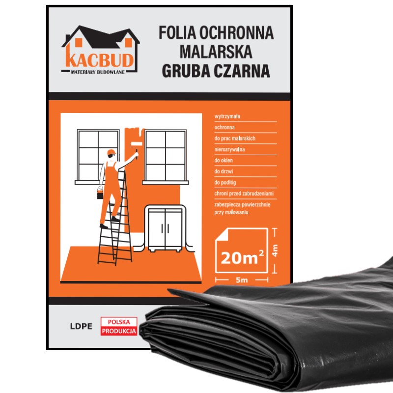 Folia malarska gruba czarna firmy Kacbud to niezawodny materiał ochronny, który dzięki swojej wytrzymałości, dużej powierzchni ochronnej i łatwości w użyciu jest niezastąpiony podczas różnorodnych prac budowlanych i remontowych. To idealne rozwiązanie dla profesjonalistów oraz amatorów, dbających o skuteczne zabezpieczenie powierzchni i przedmiotów przed zabrudzeniem i uszkodzeniem w trakcie malowania i remontów.