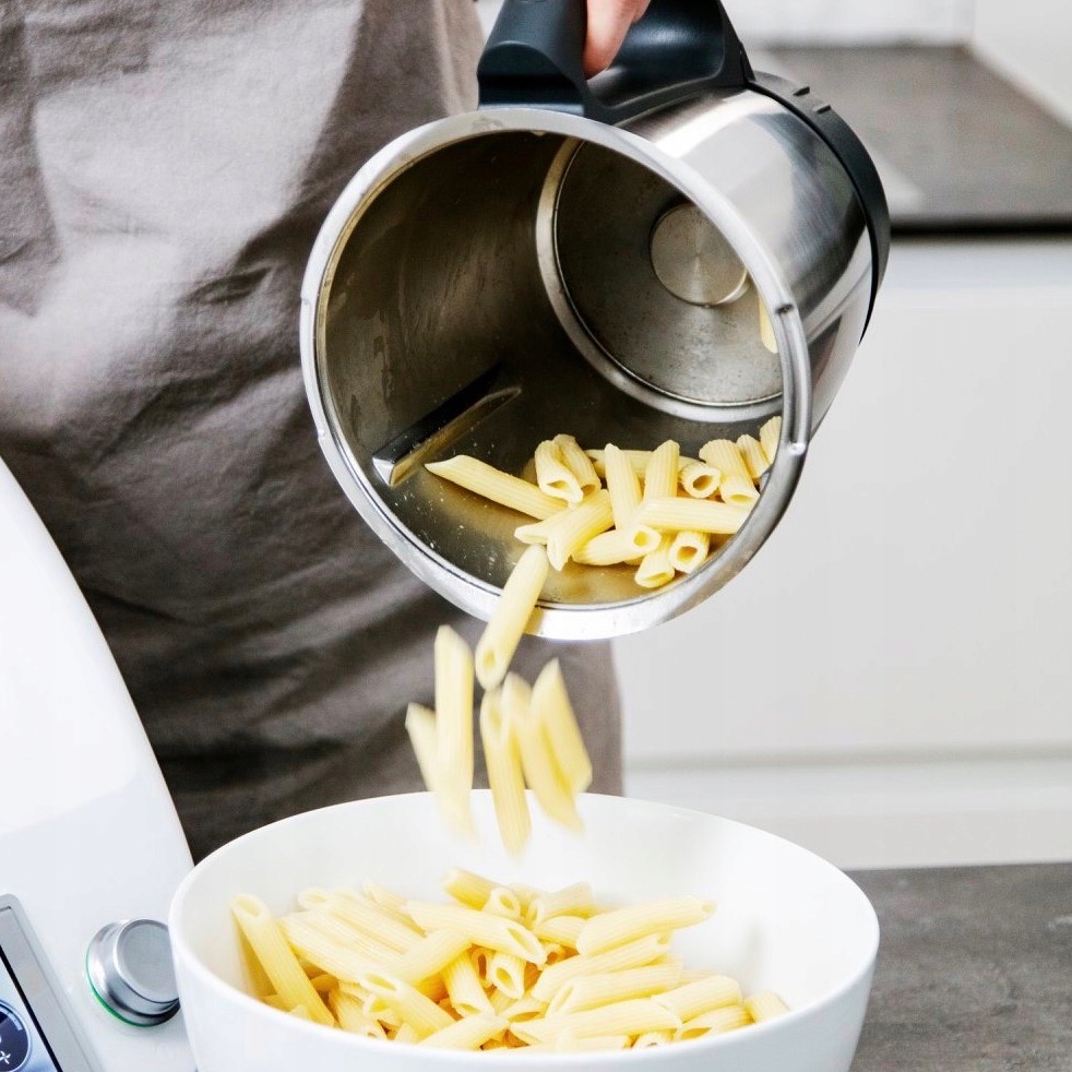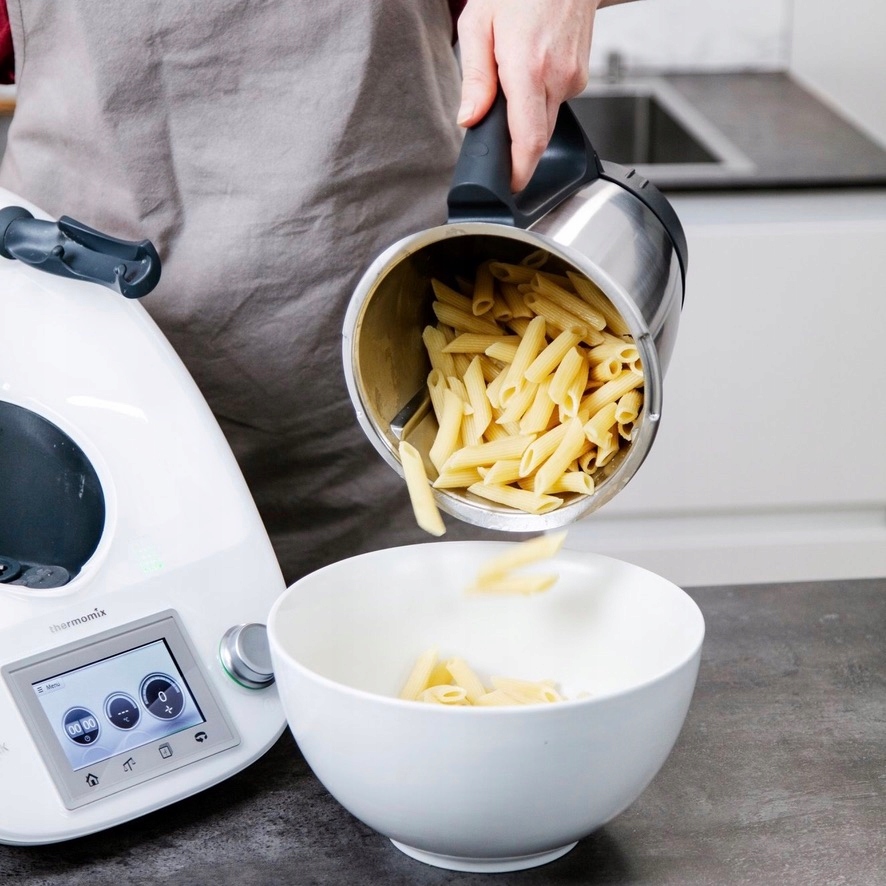 Замес, смешивание и измельчение - ножи Thermomix - действительно универсальные инструменты. Но то, что действительно очень полезно, иногда это может раздражать. Особенно для приготовления sous vide ножи мешают и они могут разрезать вакуумные пакеты для стейков. Картофель или сосиски могут быть повреждены во время приготовление пищи, и макароны запутаться в ноже.