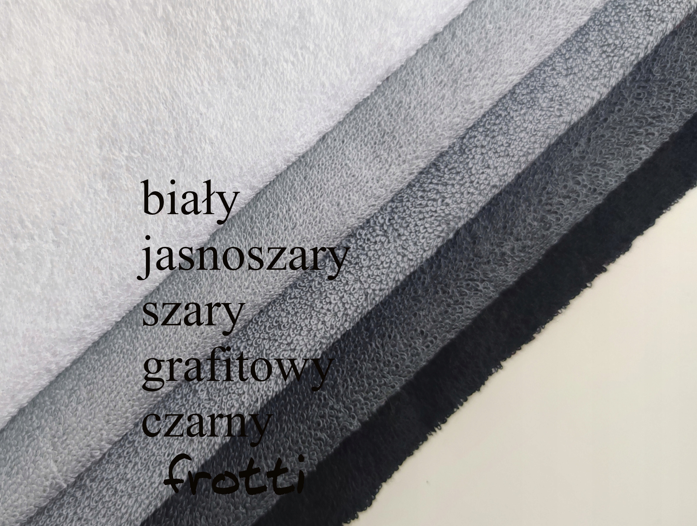 biały, beżowy, żółty, bordowy, żółty ciemny, pomarańczowy, fioletowy, brązowy ciemny, seledynowy, zielony szmaragdowy, oliwkowy, różowy, fuksjowy, bakłażanowy, szary, grafitowy, jasnoszary, błękitny, granatowy, turkusowy, czerwony, czarny, cappuccino, zielony butelkowy.
