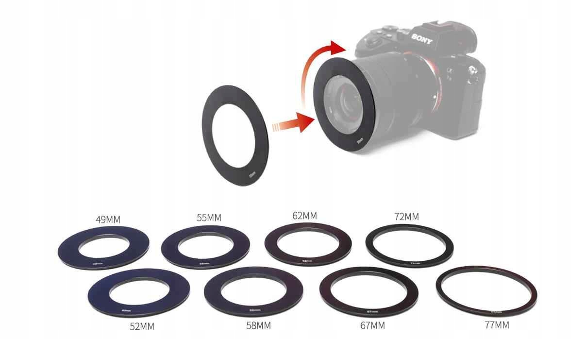 TP2 jest standardowo wyposażony w 8 pierścieni adaptera obiektywu (49/52/55/58/62/67/72/77mm).