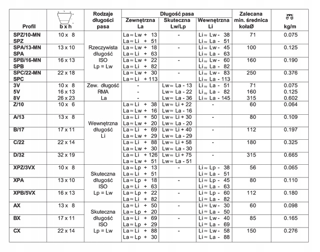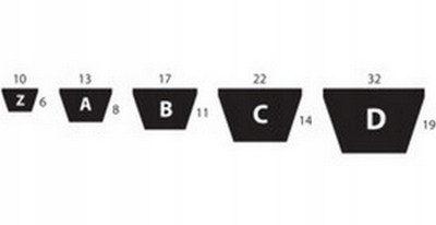 Клиновые ремни оседают в поперечном сечении в форме равнобедренной трапеции или близкой к трапеции. Эта форма обеспечивает большое значение силы трения с небольшим предварительным натяжением ремня. Позволяет также хорошее сотрудничество с шкивами небольшого диаметра, порядка 40÷80 мм, благодаря требуется небольшой угол обвязки. В настоящее время клиновые ремни изготавливаются в двух вариантах структурных, как покрытые ремни или ремни со скошенными сторонами. Волокна, несущие нагрузки в покрытые ремни лежат между резиновым сердечником и резиновой накладкой, в то время как весь ремень обернут ткань для покрытия, называемая оберткой или тканью для покрытия, которая увеличивает жесткость ремня в направлении поперечной. Сердечник - это несущая часть ремня, которая через обертку укладывается в паз шкива, с другой стороны, наложение представляет собой эластичный слой, покрывающий несущие волокна снаружи. Ремни со скошенными стороны, также называемые полосами с открытыми боковыми поверхностями, не имеют покрытия. Жесткость в поперечное направление движения ремня, при одновременной гибкости ремня в направлении движения, достигается за счет поперечной к направлению движения формы волокон наполнителя. Волокнамолекулы материала-чаще всего эластомера-расположены фронтально относительно боковых поверхностей. Это обеспечивает высокую износостойкость боковых поверхностей. Кроме того, боковые поверхности ремня они отшлифованы, что повышает их гладкость и точность изготовления. Кроме того, форма поперечного сечения Поперечный не претерпевает существенных деформаций во время прогиба на шкиве, поэтому площадь адгезии не уменьшается. Проскальзывание ремня невелико и значение передаваемой мощности он выше при аналогичных габаритных размерах по сравнению с полосой.