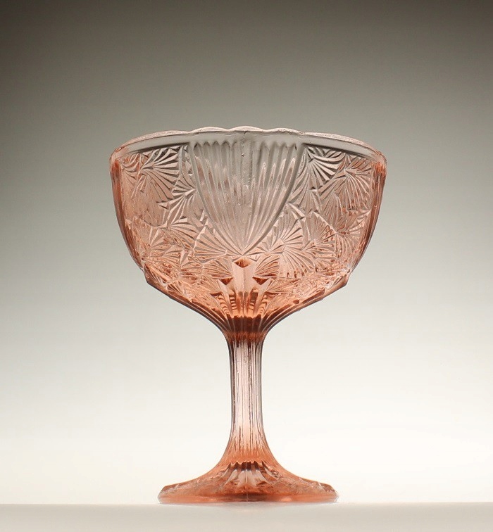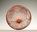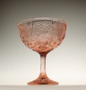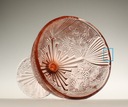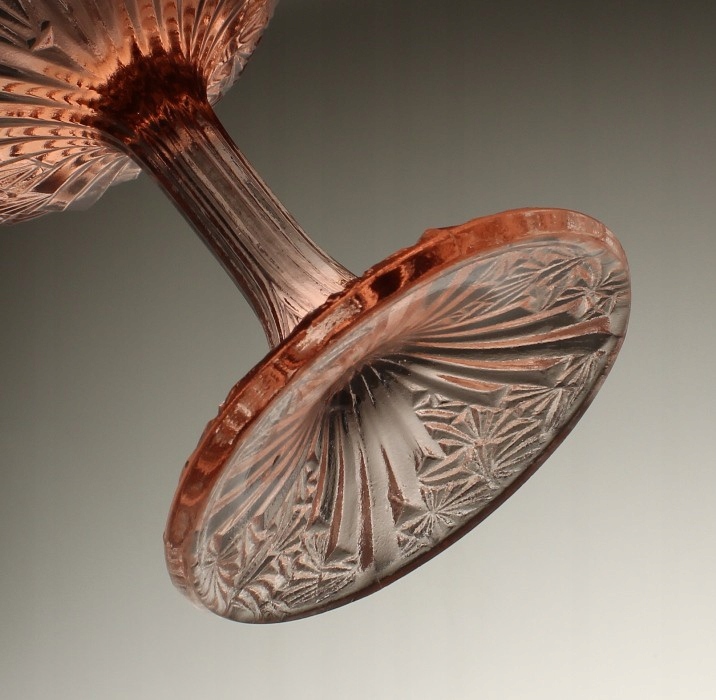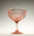 Secesyjna patera na łakocie z różowego szkła prasowanego. Pochodzi z Huty Szkła Gospodarczego „Ząbkowice” w Dąbrowie Górniczej. W katalogu huty z 1910r. patera ma numer 1178/II. Model zamknięty.