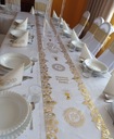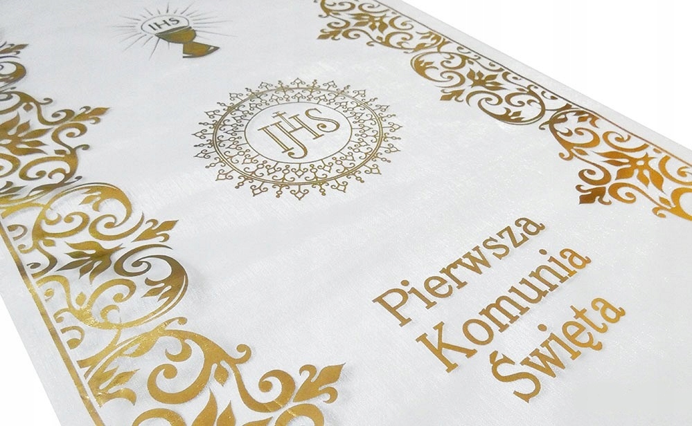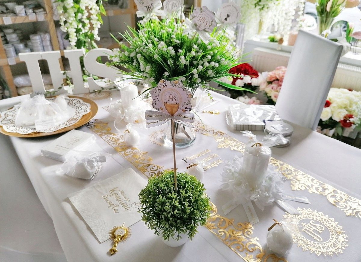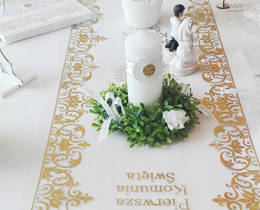 Piękna i przede wszystkim elegancka organza, na której znajduje się złoty połyskujący nadruk dopełni ona wystrój stołu podczas uroczystości Pierwszej Komunii Świętej. Nasz stół stanie się szykowny, a goście będą zachwycenia prostotą i elegancją dekoracji.