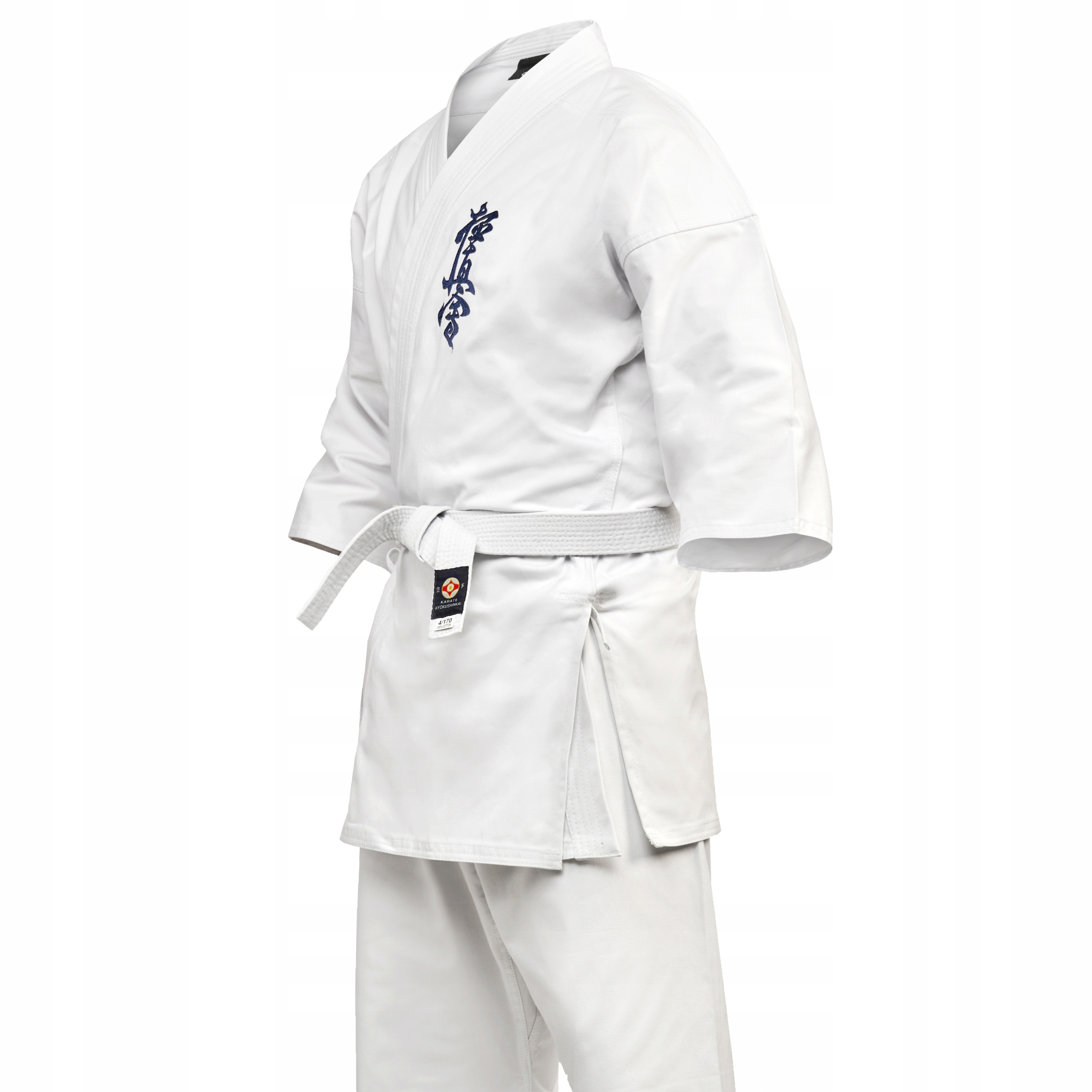 Klasyczna bluza kimona Kyokushin Overlord z szerokimi opadającymi rękawami o długości ¾ i granatowym haftem Kyokushin kanji na lewej piersi wiązana jest wewnętrznymi i zewnętrznymi troczkami.
