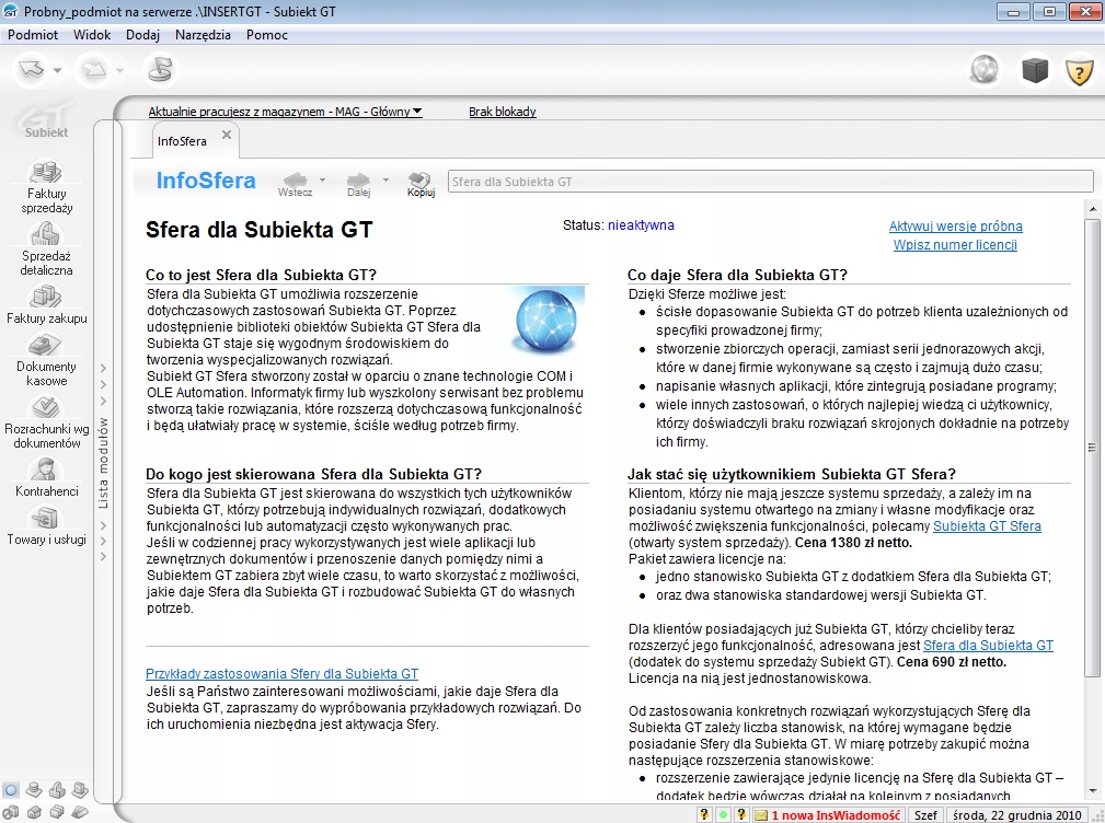 Z rozbudowanych możliwości, jakie daje Subiekt GT Sfera skorzystać mogą również dotychczasowi użytkownicy Subiekta GT, którzy zakupią dodatek Sfera dla Subiekta GT.