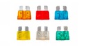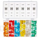 Zestaw bezpieczników samochodowych zapakowany w praktyczne wygodne pudełko umożliwiające porządkowanie bezpieczników według ich mocy.