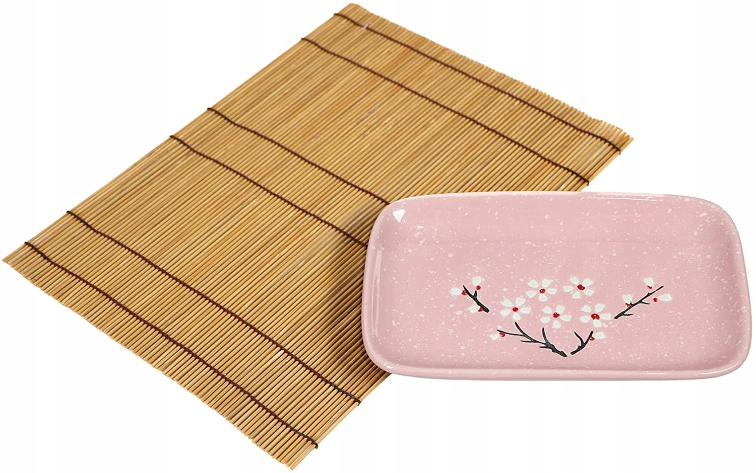 Exzact 10 pcs Sushi Set - 2 x Sushi Plates, 2 x Dip Bowls, 2 x Bamboo Placemats, 2 x Bamboo Chopsticks Rests, 2 Pairs of Chopsticks – Highquality Porcelain – Beautifully Presented in Gift Box - Pink